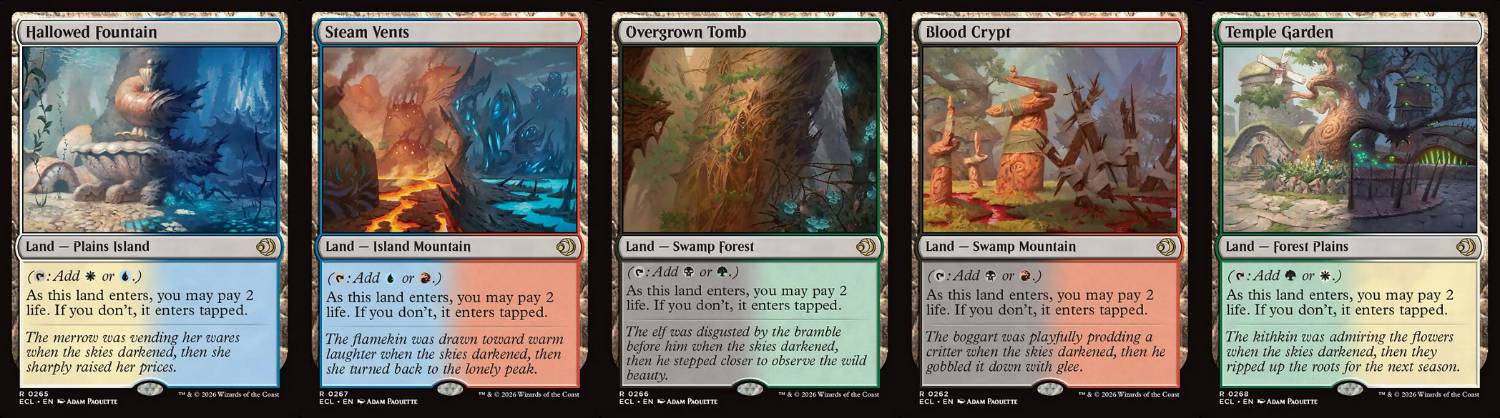 然而,因為ECL這五張電震地2026年才出,到了2029年初標準輪替時,EOE的五張電震地將會先被輪替掉,反而會讓ECL的這五個電震地色組變得較為優勢。不過這也不是頭一遭了,只能期望老威盡量少做這種商業優先於遊戲性的決策了。