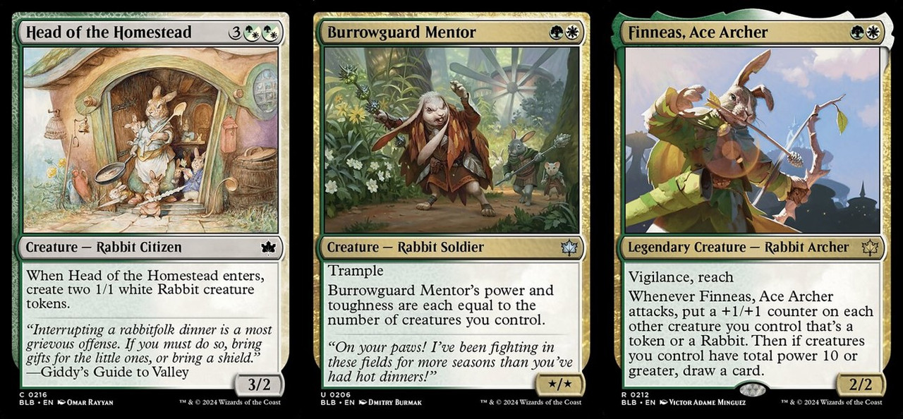 U卡的Burrowguard Mentor簡單暴力,生物越多就越強,自帶踐踏不用怕打不穿;而C卡的Head of the Homestead五費一帶三,作為主題的搭配單卡相當高效。R卡傳奇Finneas, Ace Archer只要能活到攻擊後,就能讓你操控的兔子們群體放豆,不小心還能多抽一張牌。可惜這個效果影響不到自己,通常沒有保護咒語護航,打出去後應該就沒有下一次了。