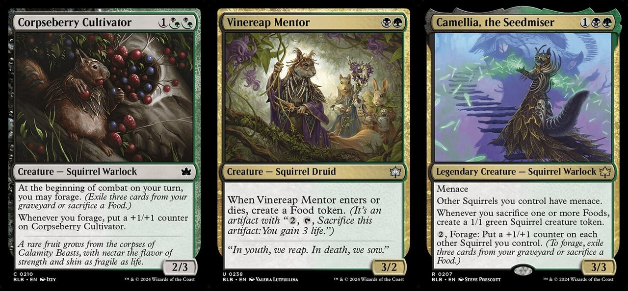 U卡的Vinereap Mentor牌面上就是寫著「賺」,也是少數雙色U卡中自帶主題觸發源的牌。C卡的Corpseberry Cultivator只要覓糧觸發一次變成3/4的體格就很能打了。再來,R卡傳奇Camellia, the Seedmiser是一個從覓糧機制中獲益的松鼠種族領主,松鼠跟牠自己會威懾不說,還可以犧牲食品生松鼠然後順便全家灌大。打這個色組的好處都集合在牠身上了。