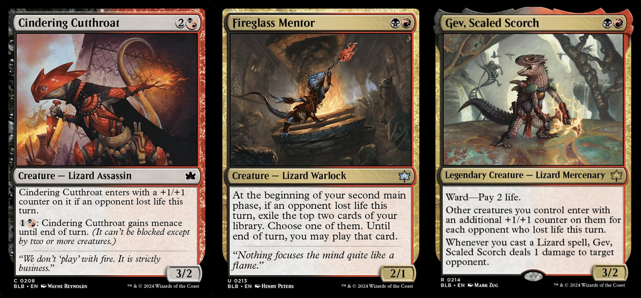 而C卡的Cindering Cutthroat本身除了主題回報單卡外,本身的起動效果給威懾也有助於你在攻擊時造成傷害來滿足主題條件。至於R卡傳奇Gev, Scaled Scorch就相當厲害了,紅黑的主題與主題種族 — 蜥蜴結合為一,只要施放主題種族生物就能對對手造成傷害滿足主題,而生物進場又可以因為滿足主題而加豆。本身的施放費用又相當低,這張牌會是進入紅黑主題的一大訊號。