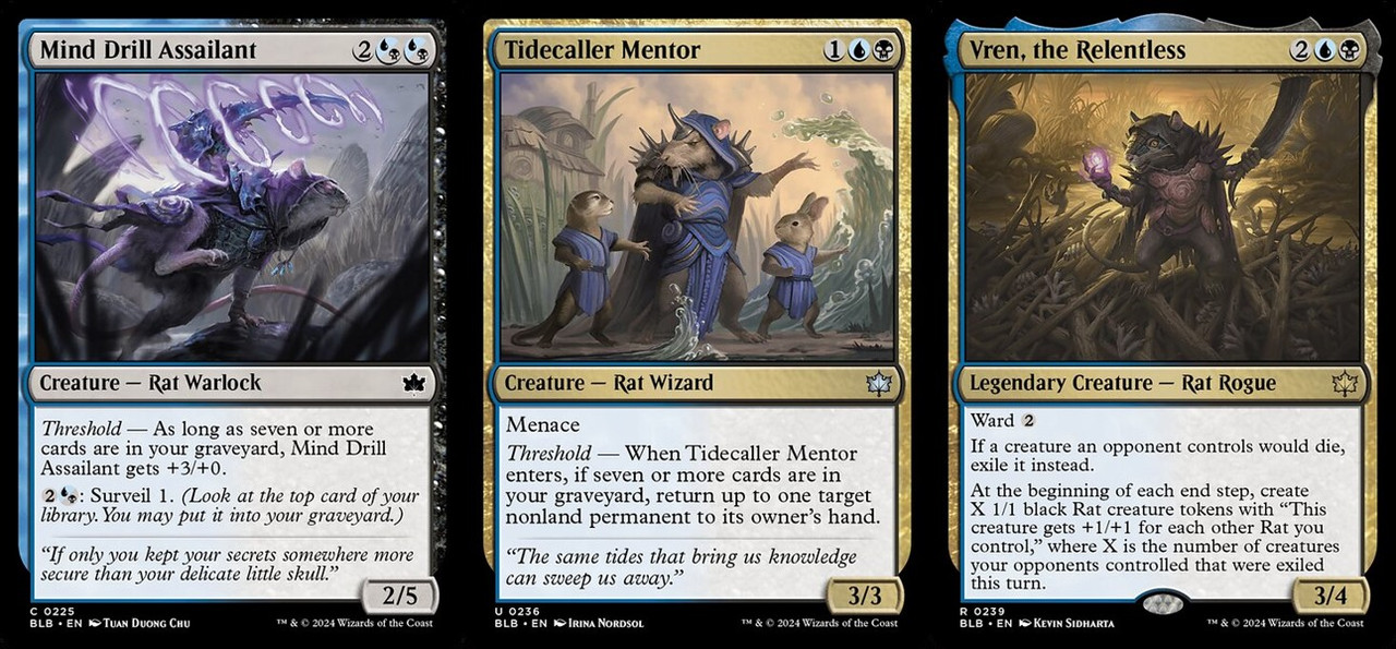而R卡傳奇Vren, the Relentless則對門檻機制的支援較不顯著,使對手生物死去改為放逐的效果更像是用來阻止對手的門檻。而牠本身的效果比較偏支援藍黑的老鼠種族主題,,有點像是弱化版的劫特叛徒卡力塔,每個結束步驟都會檢視有多少張對手的生物牌被放逐,而你派出等量的1/1老鼠tokens。