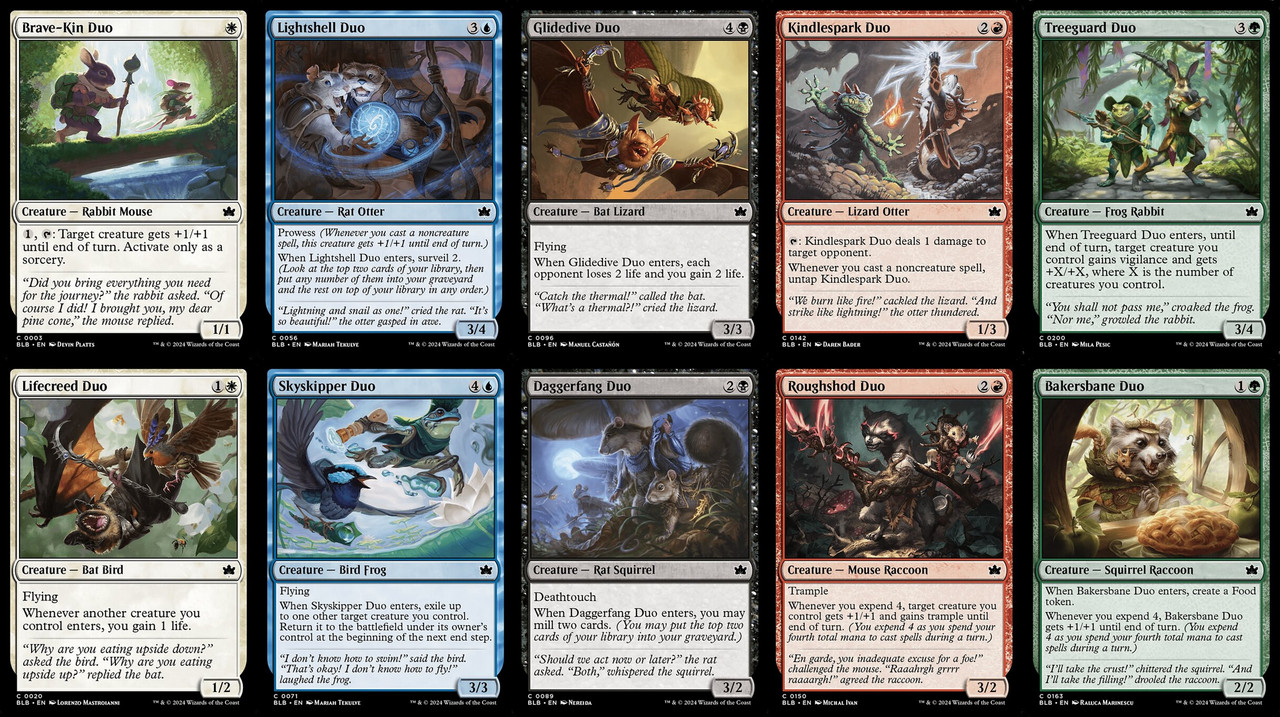 雙人組是設計團隊為了讓玩家在構築限制賽方便,特別設計一組10張的雙種族合一的單色生物牌,當然,他們對應的顏色也符合前面說到十種雙色色組所對應的種族。例如白色的Brave-Kin Duo對應的種族即為紅白的家鼠、以及白綠的兔子;而另一張白色的Lifecreed Duo則對應了黑白的蝙蝠、以及藍白的鳥。而牠們的異能也或多或少與對應色組的主題有關。