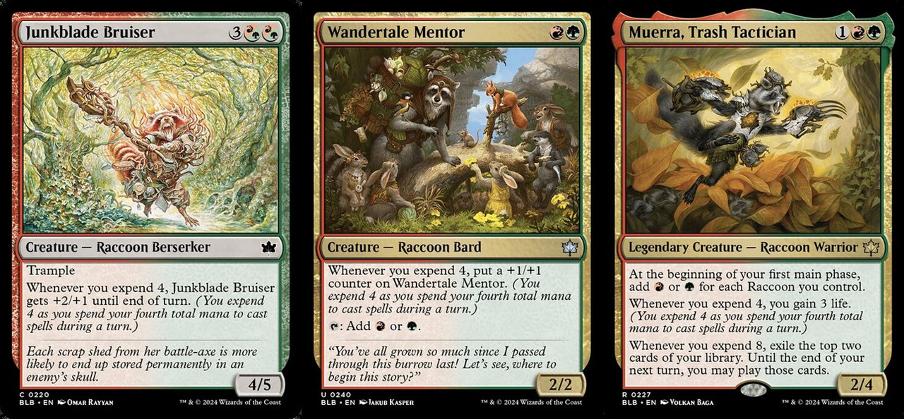 花銷在初步看過BLB的紅綠相關牌張後,我認為不是一個值得為之圍繞構築的機制,當做一個獲得額外優勢的輔助主題可能更為適合。而紅綠色組對應的種族是浣熊,但在看過預覽的牌張後,似乎也沒看到太多種族的協同效果;浣熊們比起抱團合作,也許更在意過好自己快意的花銷生活。