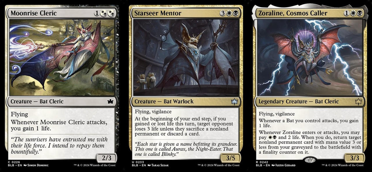 U卡的Starseer Mentor五費3/5飛行警戒超級頂不說,在你結束階段時如果你本回合生命值有變動,就可以開始蠶食對手的資源。C卡的Moonrise Cleric則是一個主題觸發來源,只要攻擊就能獲得1點生命。而R卡傳奇Zoraline, Cosmos Caller應該是這個系列數一數二強的牌,異能設計也跟黑白色組的主題相當扣合,蝙蝠攻擊就能獲得1點生命、而當牠進場或攻擊可以支付兩費與2點生命,來讓總魔法力值3以下的生物返場。這邊不得不額外提一下Lunar Convocation這張黑白色組的結界,這張二費的結界設計上把黑白關注血量變化的主題發揮到極致,不只單純看你血量的增或減,當你同一回合血量增與減時,你還可以額外派出一隻1/1的黑色蝙蝠,而這又能繼續支援Zoraline, Cosmos Caller等種族回報卡,達到滾雪球的驚人效果!