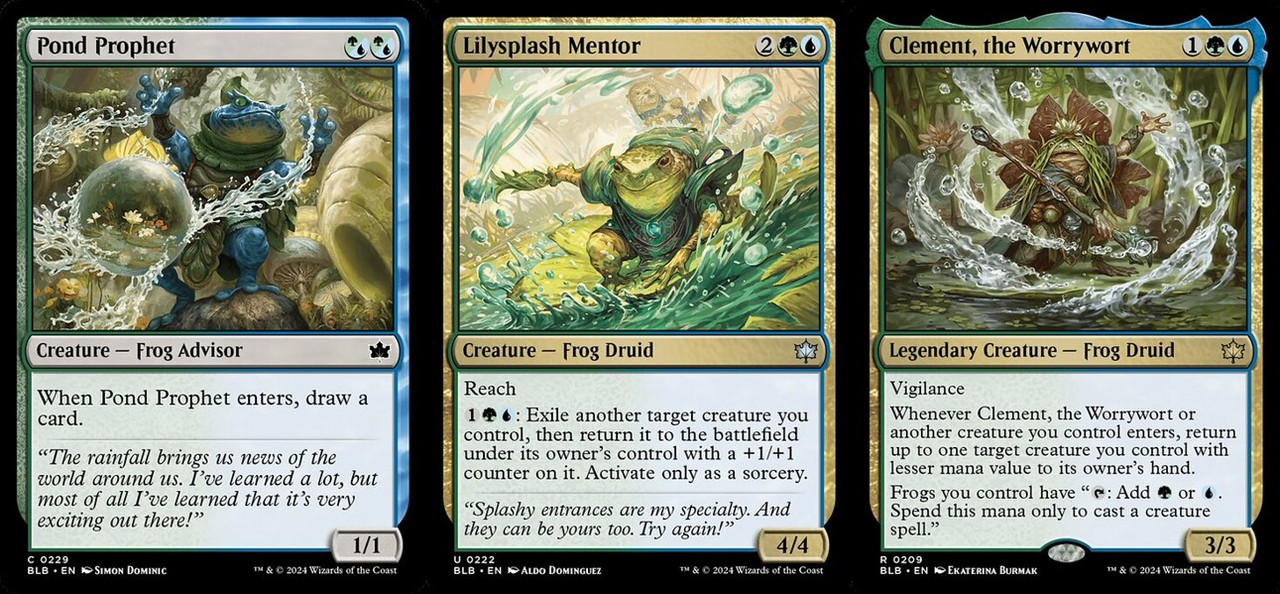 U卡的Lilysplash Mentor體格合格外,本身自帶一個觸發進離場的起動式異能,回場的生物還會變大,只可惜無法瞬間起動,應該是怕太強太賺所設的限制。C卡的Pond Prophet進場不虧牌,但本身1/1的體格在現在戰力通膨的限制賽中,基本上是拿來反覆刷進場異能用的。而R卡傳奇Clement, the Worrywort可以讓你的生物跳恰恰跳得不亦樂乎,以大回小,以小放大,進進出出、好不快活!