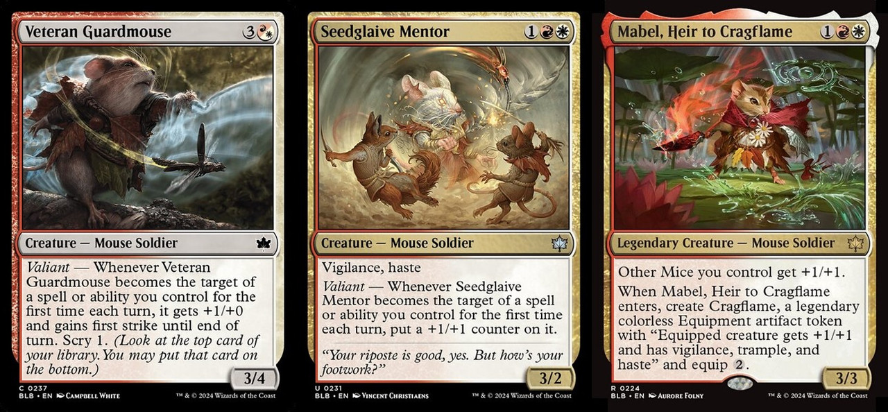 - 紅白色組中對的種族 — 家鼠(Mice)共有15張,與英武這個機制是綁定的;而英武其實觸發條件並不難,戰鬥詭計、貼皮、佩帶武具、甚至以你操控的異能指定,都能觸發英武。