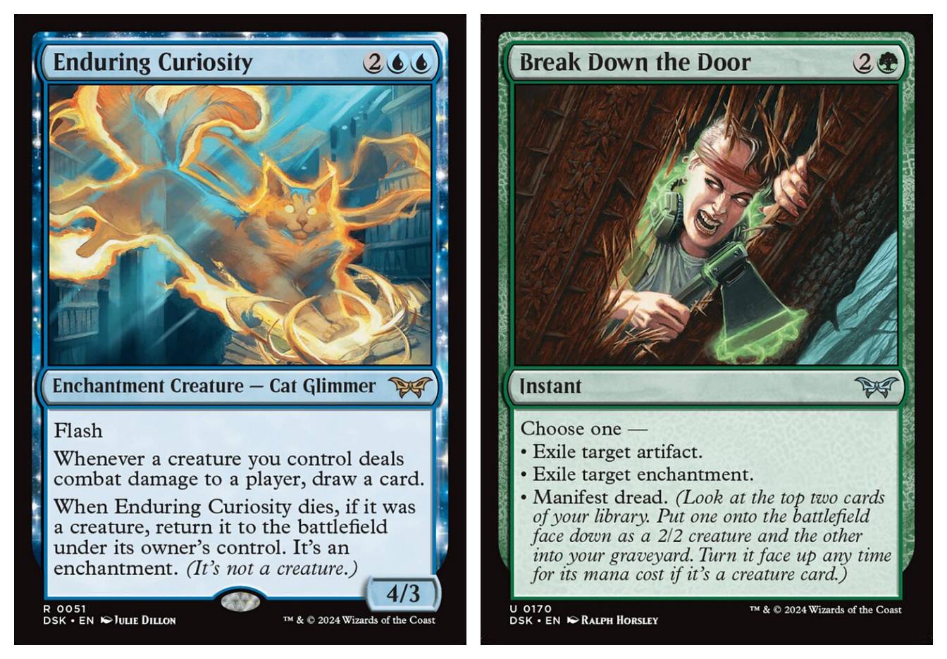 - Break Down the Door ,放逐在本系列是至關重要的課題,這張瞬間也可以視為放逐生物的單卡(場上經常有強力的結界生物),順風時想盡快收下比賽、或逆境需要奇蹟時,又能拿來在瞬間時機做一回顯化懼象,除了費用稍大外可謂神牌。