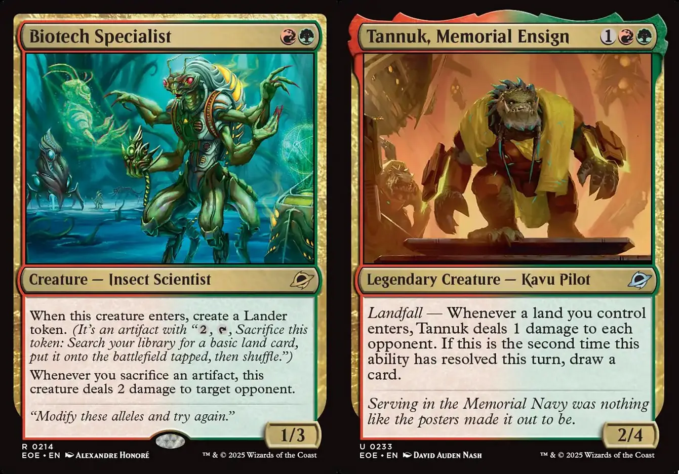 使用探地器衍生物和地落來創造法力優勢。探地器可以幫助你更容易地觸發地落效果,他在所有顏色都有,但主要分布在紅綠色組,像是 Biotech Specialist ,此外 Tannuk, Memorial Ensign