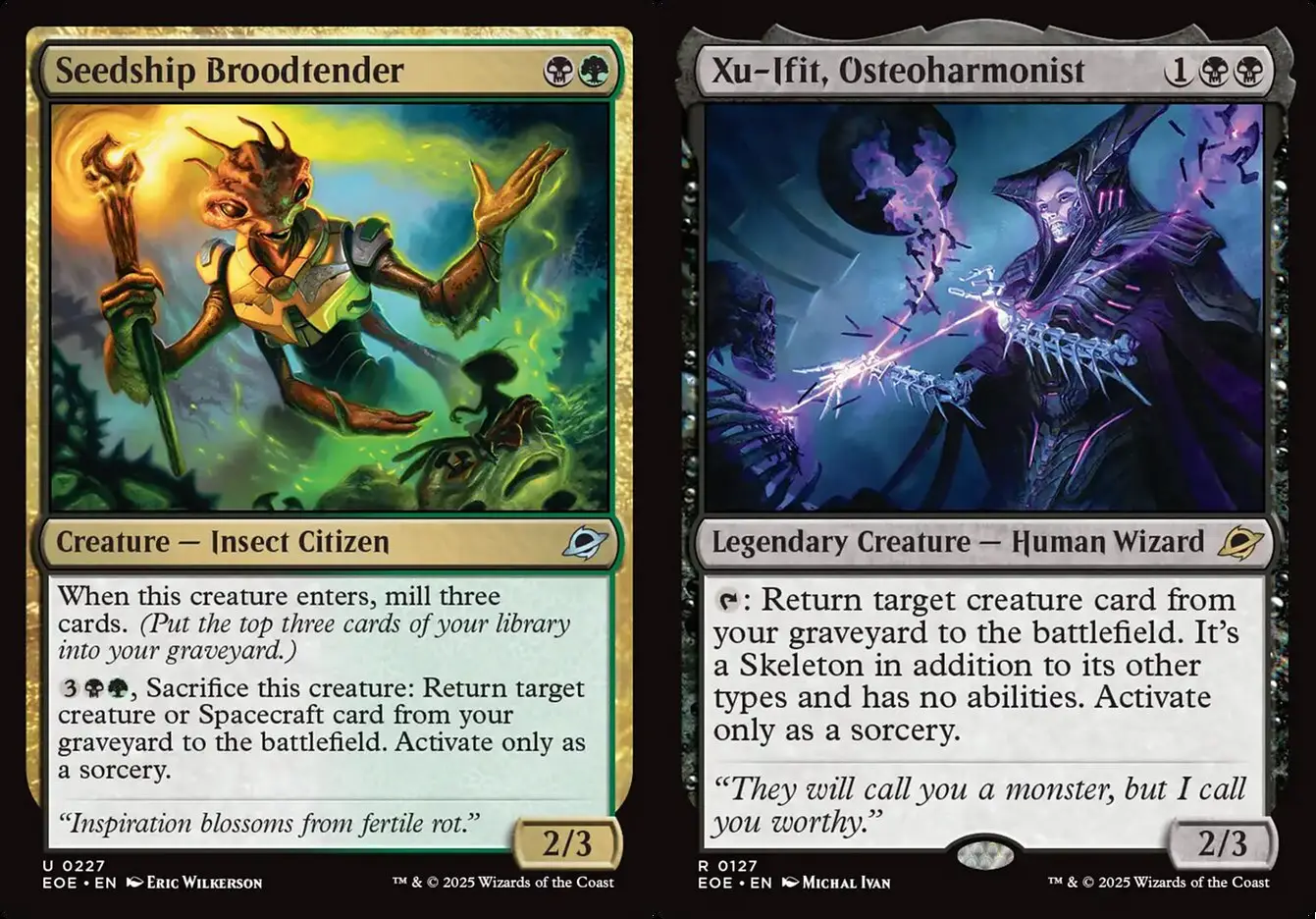 前期透過磨牌或刺探來疊加墳場,然後透過復活太空船和生物來獲得勝利。 Seedship Broodtender 是黑綠色組前期不錯的生物,接著透過他自身或是Xu-Ifit, Osteoharmonist