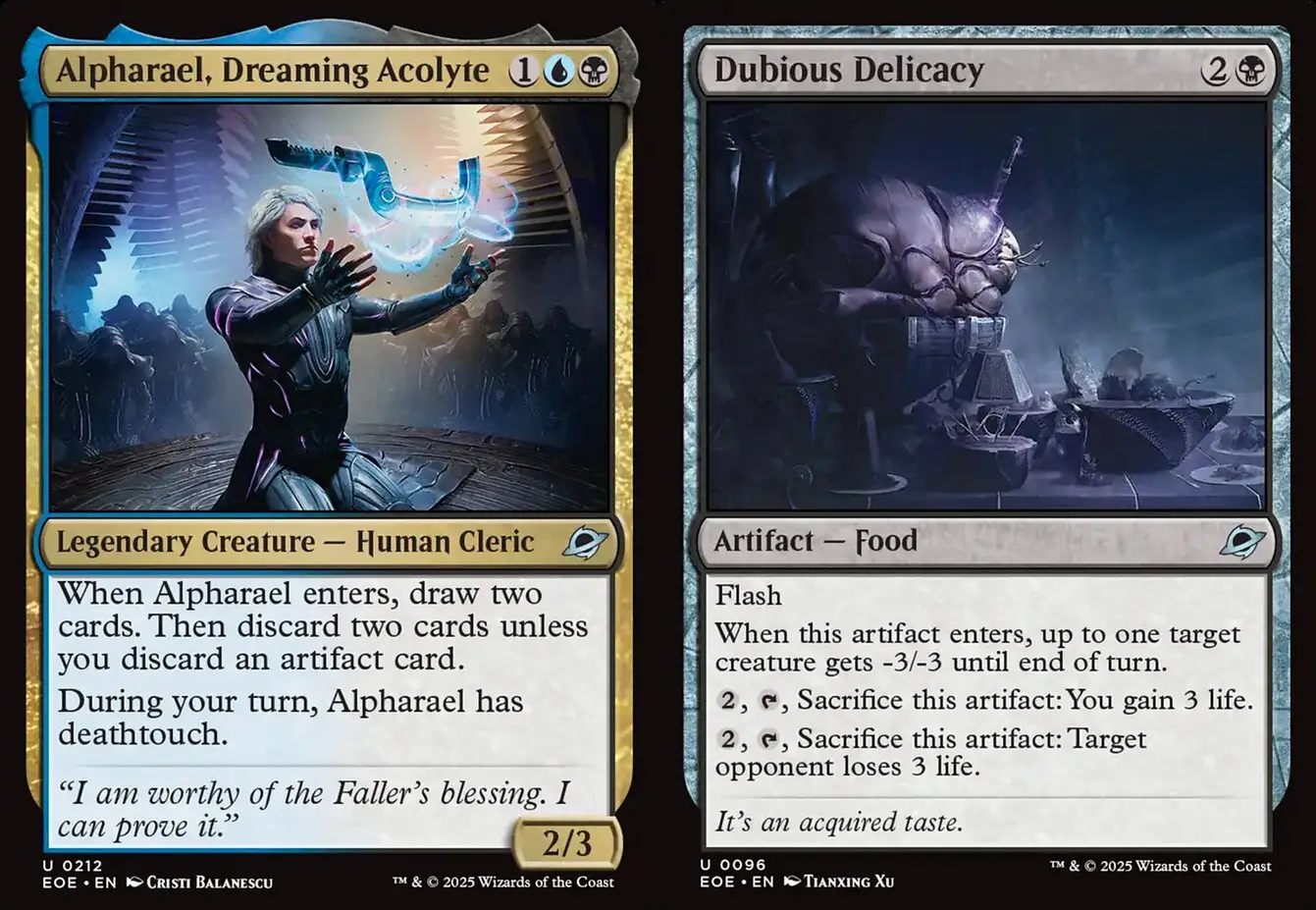 組建一個基於神器的牌組,透過消耗對手的資源來慢慢取勝。 Alpharael, Dreaming Acolyte 可以讓你補充手牌,且透過丟棄神器牌而不虧資源; Dubious Delicacy