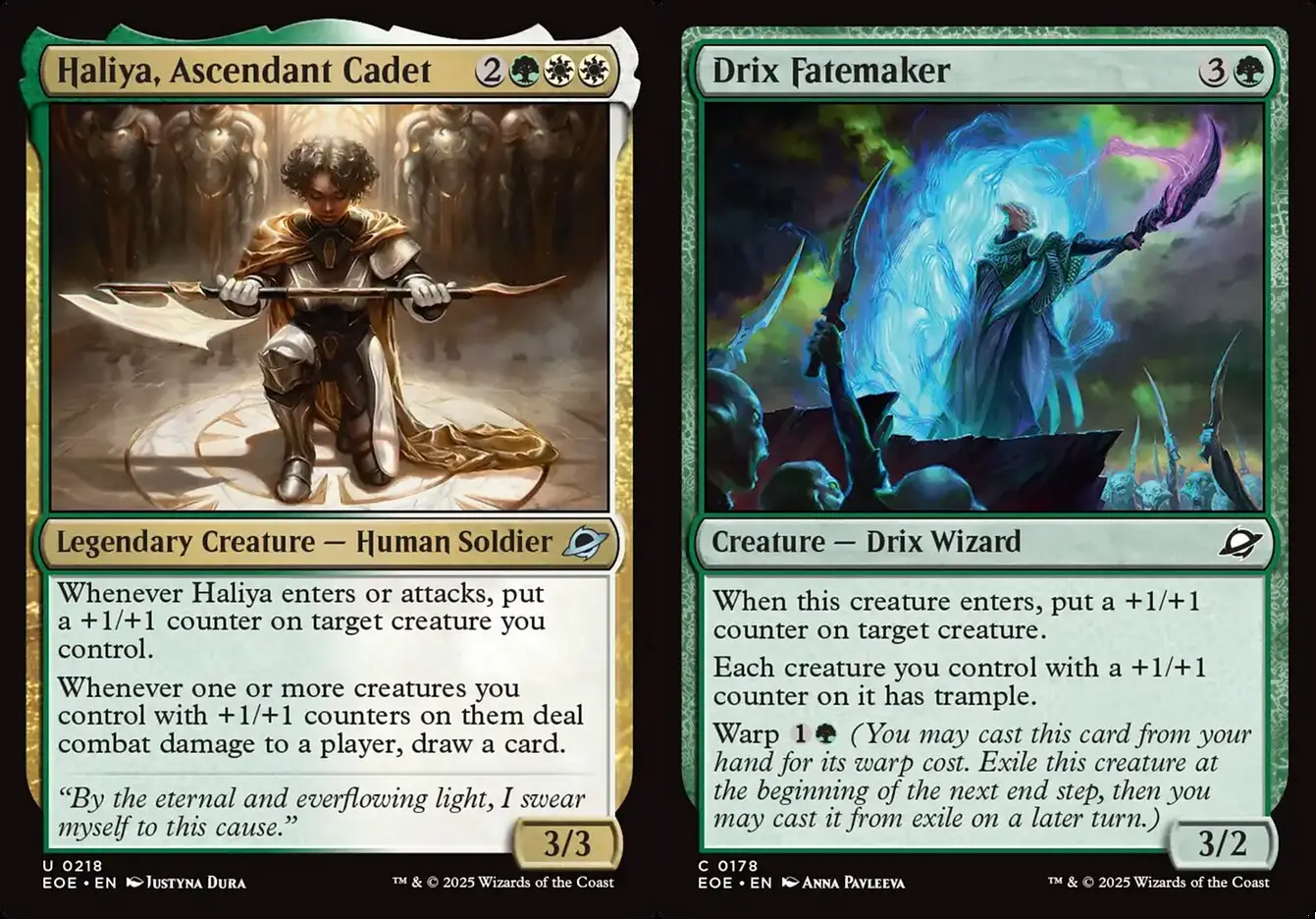 用 +1/+1 指示物強化你的整個軍隊,疊加它們並看著敵人倒下。 Haliya, Ascendant Cadet 可以確保你的生物全副武裝,且你的手牌資源充足; Drix Fatemaker