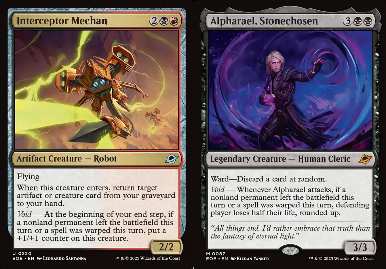 使用空洞機制,以生物和神器為代價,觸發毀滅性的事件。 Interceptor Mechan 持續觸發空洞異能的話,作為空中打點是很恐怖的存在; Alpharael, Stonechosen