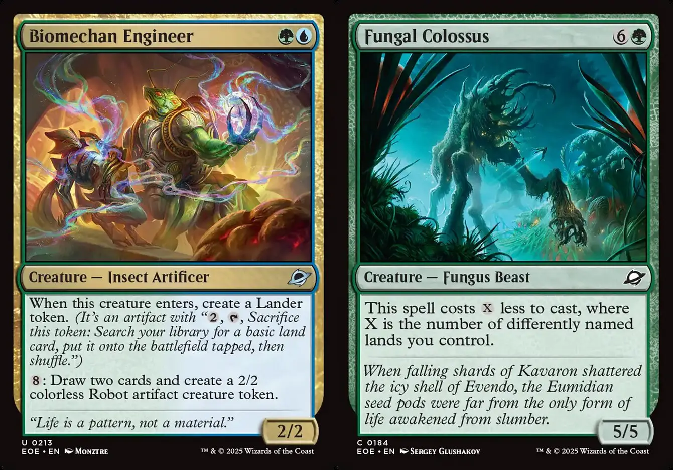 藍綠色組透過探地器可以來進行跳費快速進到後期大費資源來壓制對手, Biomechan Engineer 就是此色組的優質生物,後期也可以帶來手牌跟生物資源;此外藍綠也有單卡會關注你操控的地有不同名稱,像是 Fungal Colossus