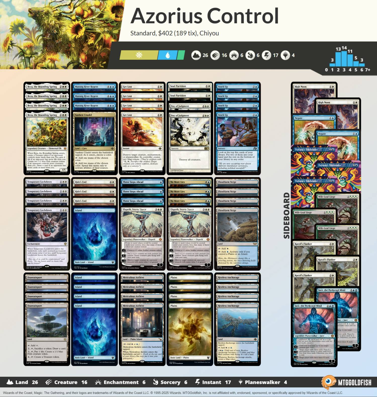 會選擇白藍控這個deck其實蠻意外的,我回歸標準是四月跟豬鼻子去平方打牌,他借我藍黑中速,拿了個3-0,所以回家馬上用MO組了一套,也打得不錯,但考慮到他應該也會打藍黑這點就先排除了。之後TDM發售紅藍靈技登頂,但因為刀子太貴、加上不想打那麼主流的deck,就在金魚的meta頁面往下找到了白藍控,抱著一試的心態組出來練了。