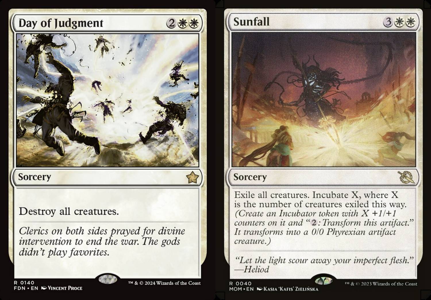 Day of judgment快一個回合還是比Sunfall好太多了,雖然Sunfall放逐生物以及撫育X很強,但多數時候是需要四回準時掃場的。