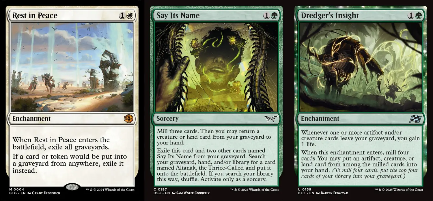 直呼其名是完全沒救了,因為這張牌的運作流程是先把牌磨進墳場,之後再從墳場回收牌,RIP在場時墳場根本不會有任何牌給你回收。