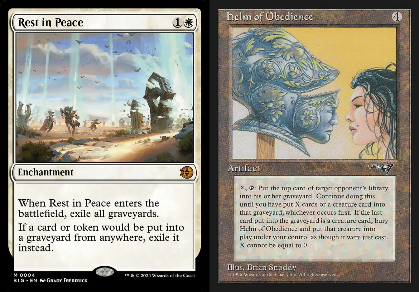 服從頭盔Combo是一個RIP的經典搭配(將RIP換成虛空地脈也是常見配置之一),因為RIP的關係,對手不會有牌磨進墳場的時候,所以只要服從頭盔一起動,對手的牌庫就會瞬間清空。