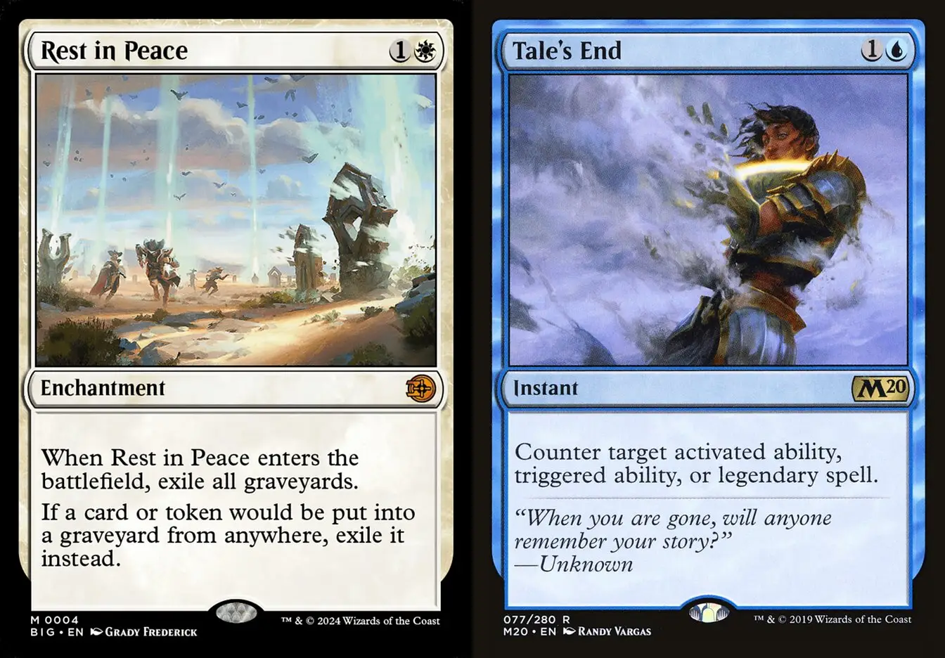 假設你回應RIP的ETB,用傳說終結康了這個放逐墳場的觸發式異能,那麼你就能保住目前已經在墳場的牌,不過因為傳說終結結算時RIP已經在場,所以傳說終結自己還是會被放逐。