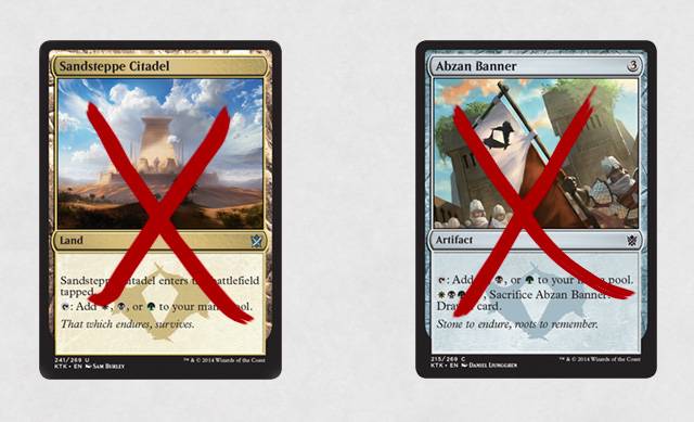同樣地,較慢的黑白套牌可能更傾向於選擇侵蝕荒漠,而不是喀洛斯洞窟和魔力聚流。然而身為快攻玩家,你必須為了維持節奏而樂於犧牲血量。橫置進場的地會拖慢速度並打斷你的魔法力曲線,而這個代價對快攻策略而言是不可承受的。