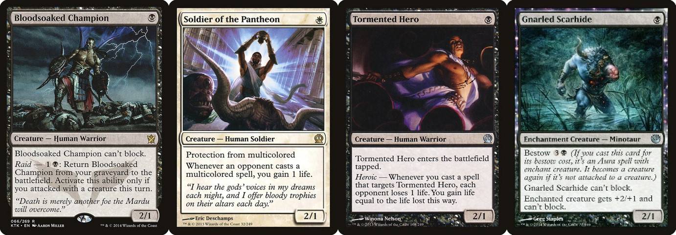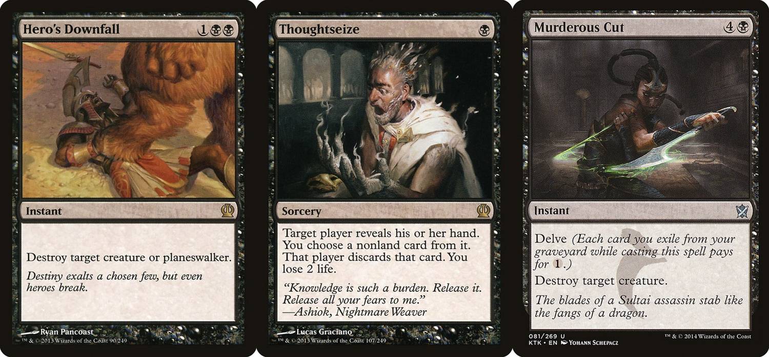 最後,讓我們看看這套牌的應對手段。英雄殉身是掃除阻擋者、確保持續進攻的可靠方案。而潰爛與奪魂斬則視情境而定,雖然使用限制較多,但其極高的魔法力效率彌補了這點。若你能用一費的潰爛、或靠掘穴(Delve)施放的奪魂斬解掉生物,並於同回合拍下自己的威脅,其所產生的節奏優勢將足以壓倒對手。
