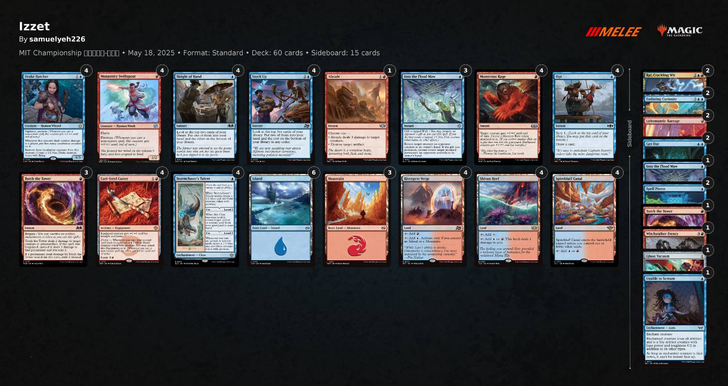 伊捷靈技(歐洲RC冠軍),用幾乎每一張都是modern強度的牌來降維打擊標準賽制,迅矛僧、水獺天賦跟戒刀的前期壓制再加上Stock Up的續航使得這套牌看起來幾乎無法擊敗。