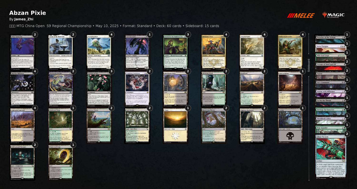 Zhi, Yimin的Abzan Pixie,初看list會覺得幾乎對到所有主流套牌都有優勢,但是也如他本人所說,對到領土霸主及黑底的中速套牌是十分的難打,亮點也在於3drop選擇了Sentinel of the Nameless City而不是之前大家投入的小攻城犀牛。