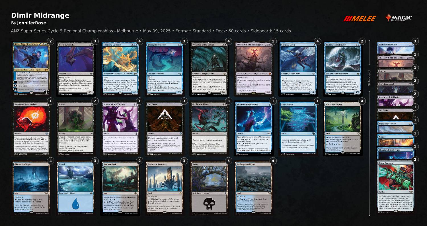 再來是我花了很多時間的藍黑中速(2025了我也不想玩這個),中間測試了許多個版本,像是正編不放蝙蝠放Duress,又比如正編2張Spell Pierce + 3張Tishana’s Tidebinder,或者是4 drop的選擇為Oildeep Gearhulk,再來是2 drop的來回測試,亦或是正編2張Gix’s Command……等,打到後來我發現一件很重要的事情: