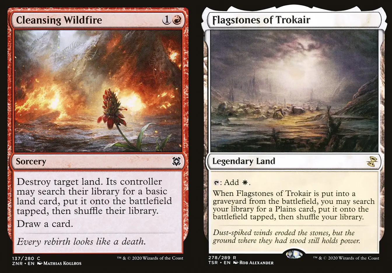 白蘭幽魅&滌地野火只要異能成功結算在目標地上,那個地的操控者就可以從牌庫找一張基本地進來,但這效果並不會檢查那塊地是否確實被消滅,所以如果拿這效應去炸不滅地,就會變成一發Ramp咒語,卓耶卡石板跡是被炸了後可以找一塊平原進來(注意不限基本地,而是任何帶平原類別的地),結論也是Ramp。對抗炸地套牌最常用的對策之一就是先定著找地地不要起動,等到要做事前才找,自炸Ramp的能力正是應對這種打法的應對措施,既然對手放慢節奏不做事,那就由我方主動Ramp,這樣節奏才不會完全被對手牽著走,費用2跳4也可以讓我們加速出萬創卡恩。