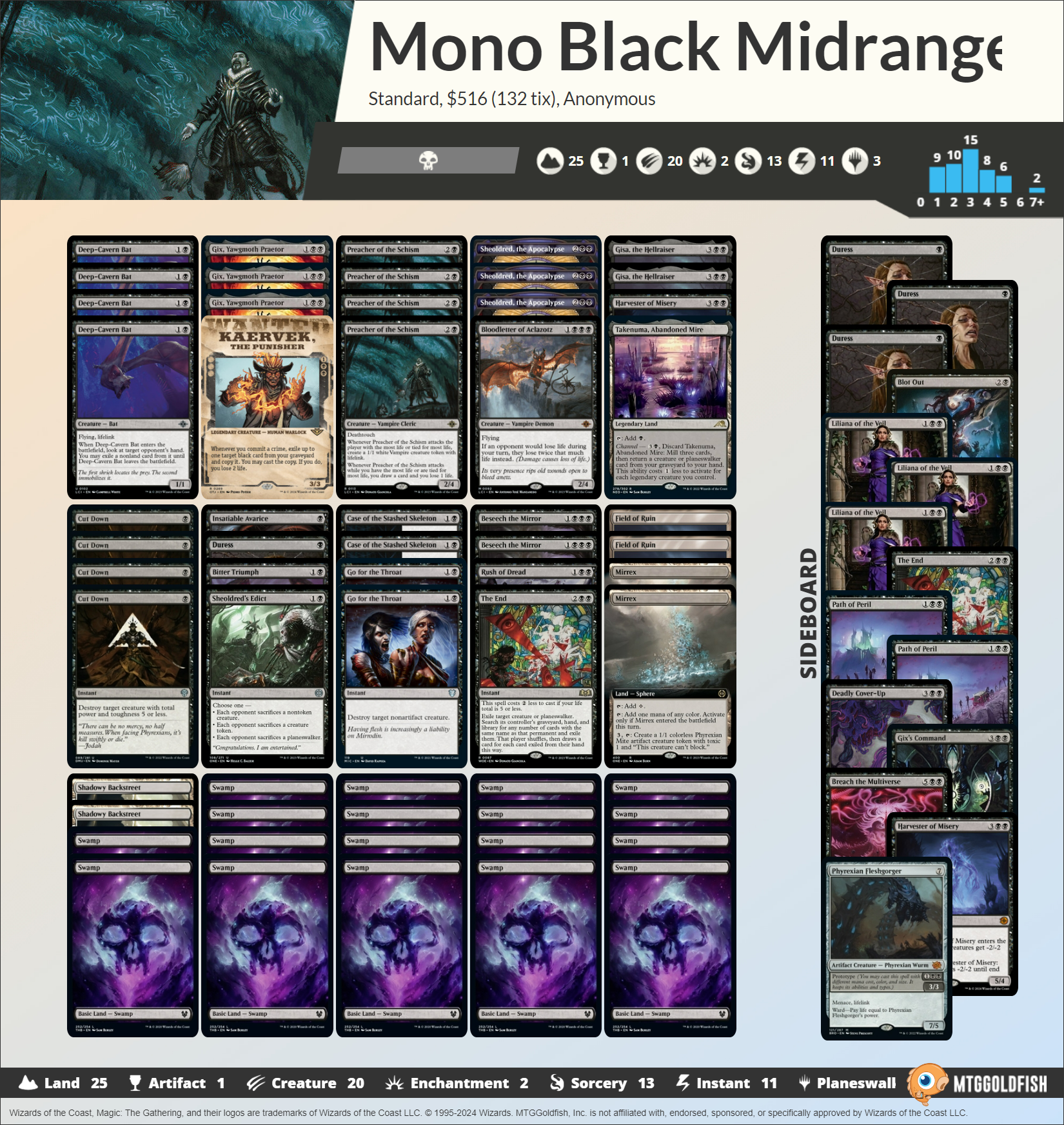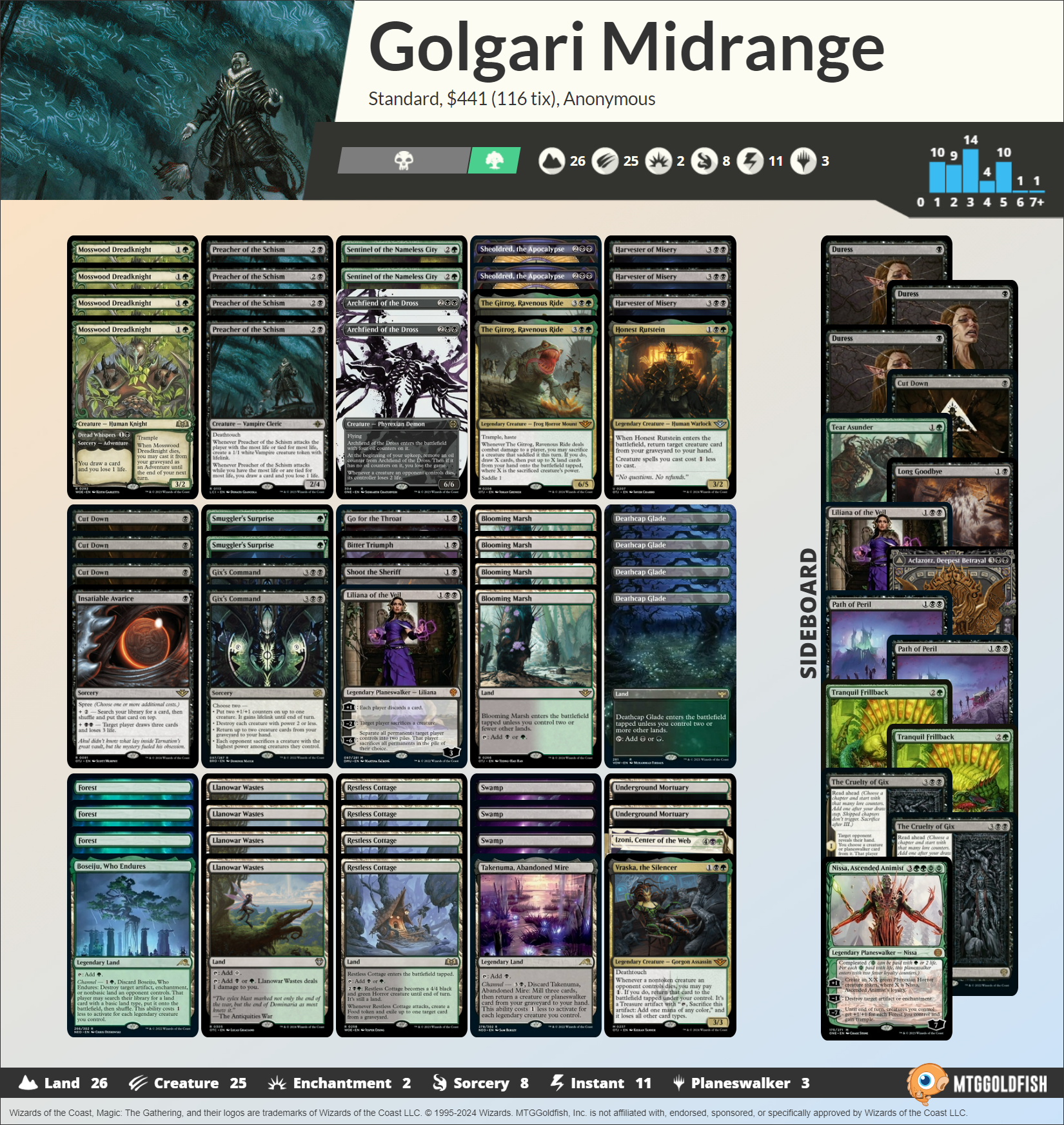 光雷驛鏢客為我們帶回五張對色快地,因此對色的中速套牌的法力曲線也因此補上了最後一塊拼圖。黑綠色組的花開沼地的加入讓黑綠色組在前期的展開更加順暢,不再需要面臨後手第一塊地是要下黑綠躺地還是沼澤,是否要保留一點黑開放,來用斬落即時解掉對手的二費曲線來拉回節奏的殘酷二選一。基本上這副還是基於既有的黑綠中速去嘗試使用OTJ新牌的構築,讓我們來看看有什麼新花樣吧!