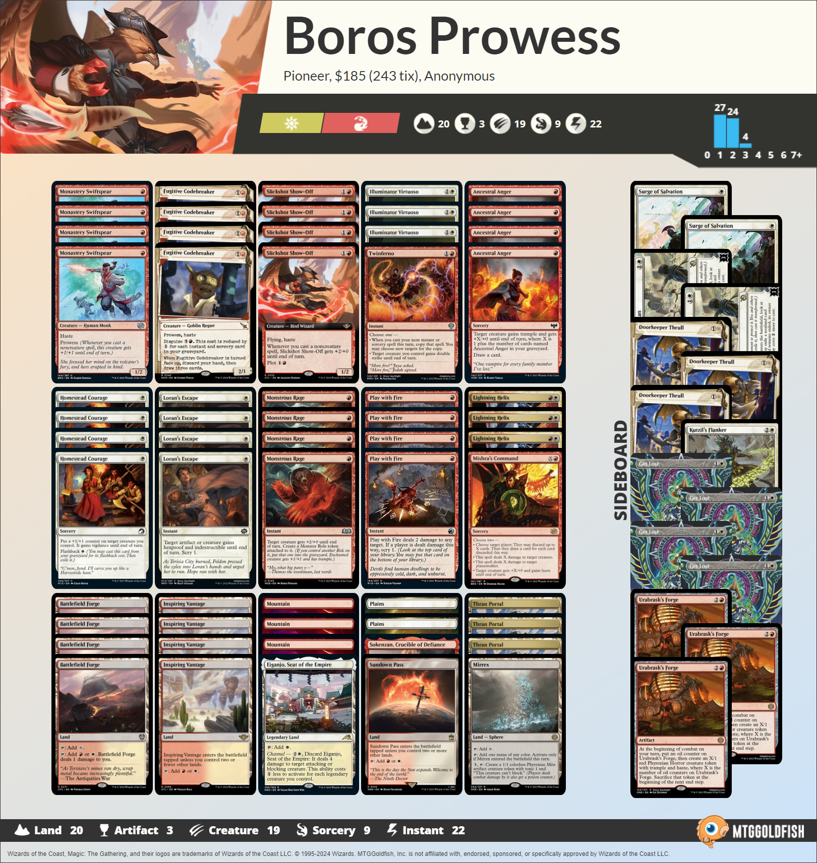 光雷驛鏢客為我們帶來更具爆發的火爐邪鬼 — 花槍幫炫耀師,而搭配原先紅快優質的寺院迅矛僧、漂泊破碼客等生物,混入白色的超強勇行主題生物耀刃名手,再加上眾多低費咒語、以及不能忘記你的啟迪勝地,鏘鏘!紅白靈技就成形啦!