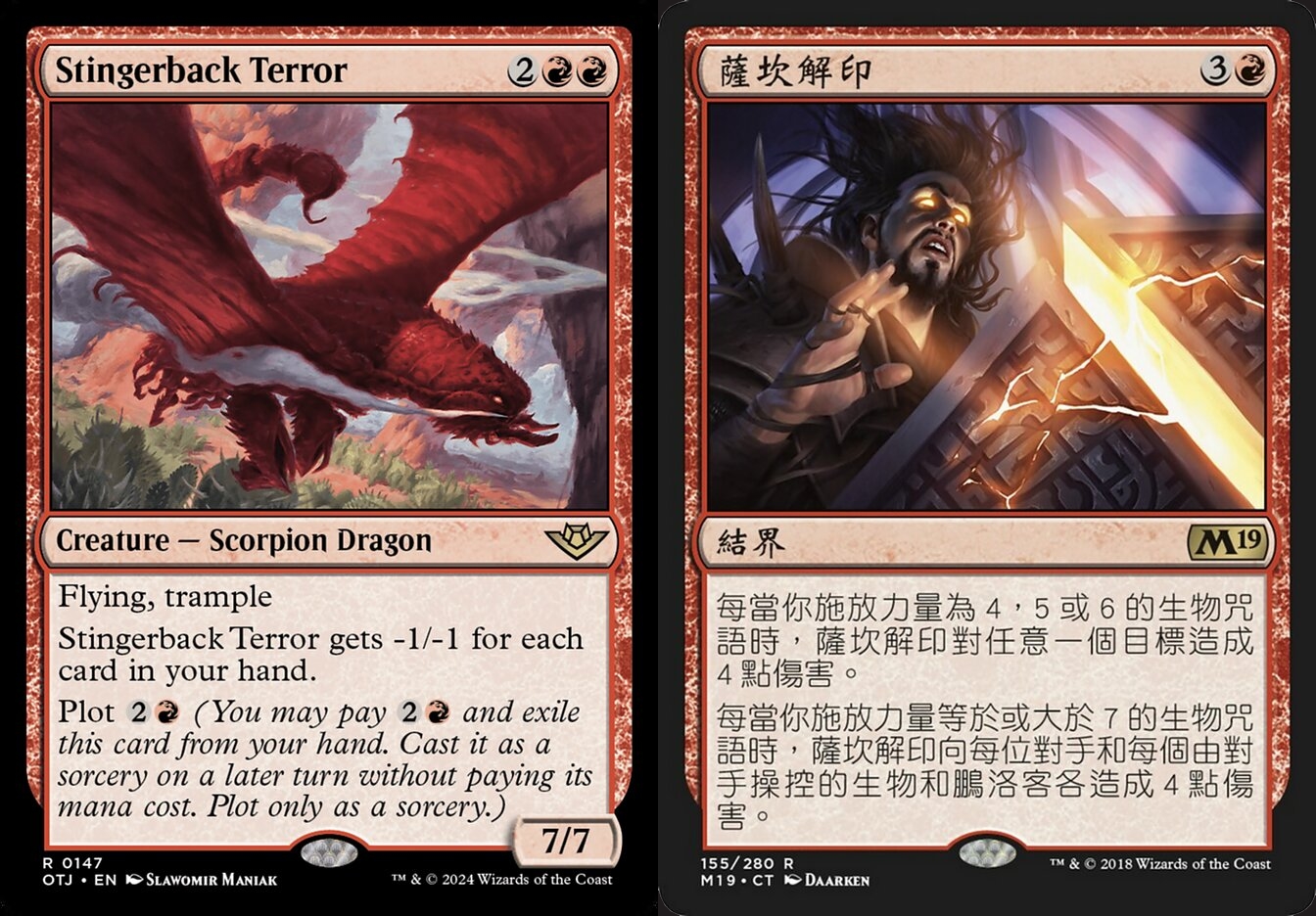 刺針背懼龍除了有著7/7飛行踐踏的面板能力與看手牌數量變小的副作用外,還有一個三費設謀的異能,在擁有一費mana頭的古魯套牌可以做到二回設謀,三回免費施放的節奏。問題是我們三回免費施放一個沒有敏捷的龍有什麼意義呢?答案就是M19的薩坎解印。