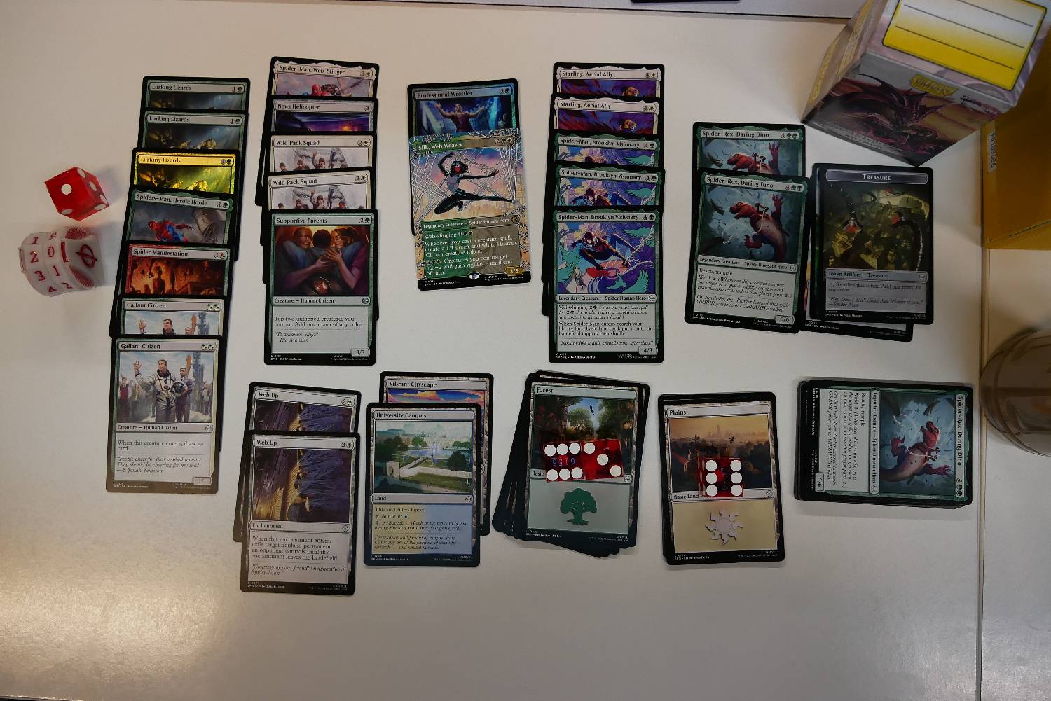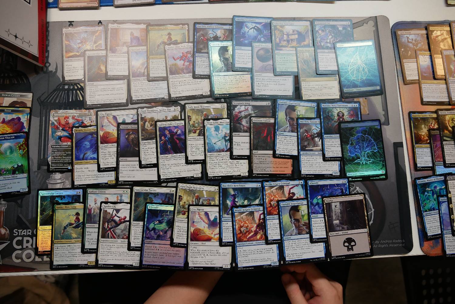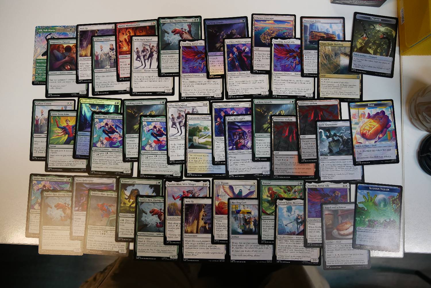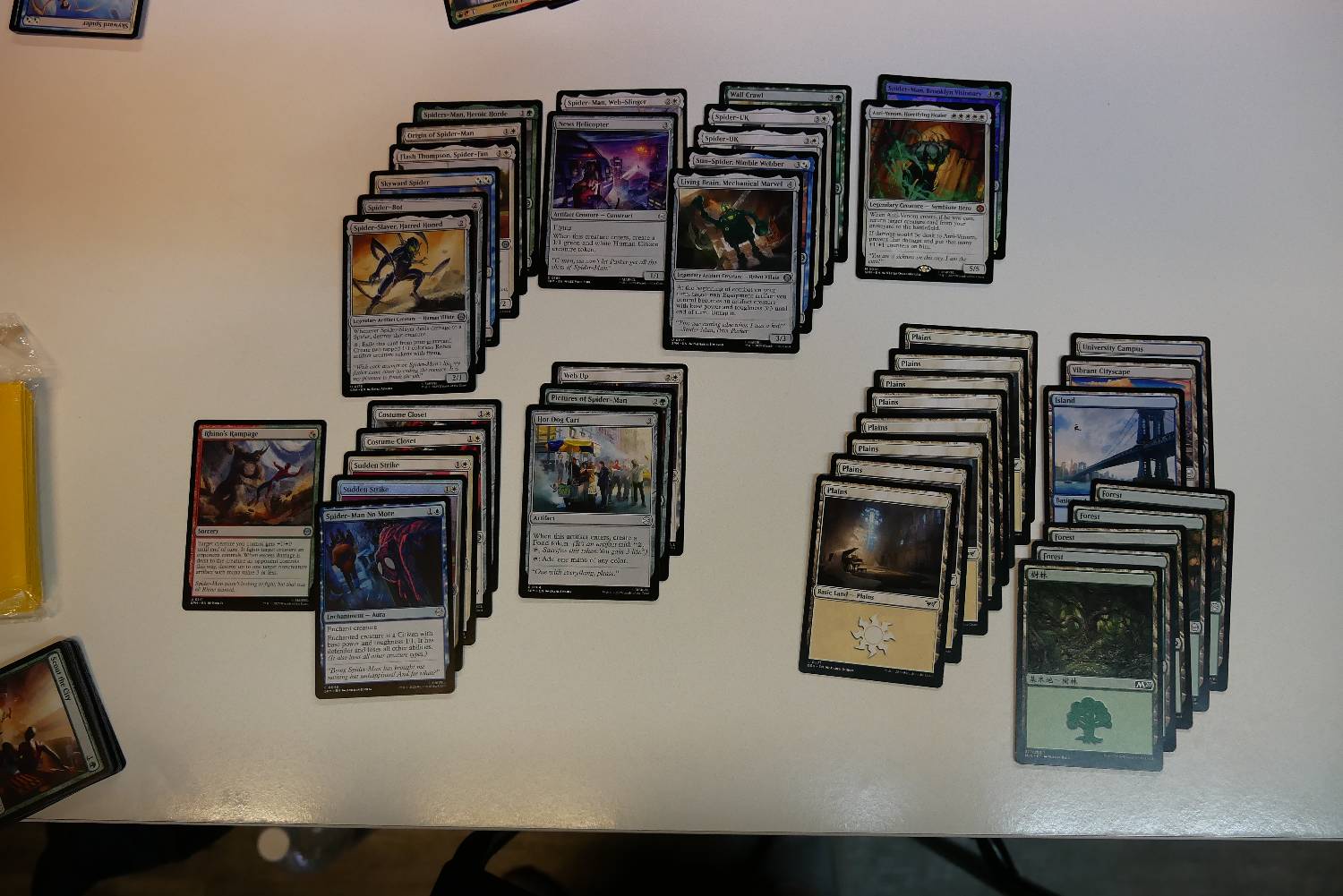 今天有一個回合,靠著Supportive Parents跟兩張Spider-Man, Brooklyn Visionary,一回合重複來回進場刷了超多張地,每有一隻生物跟兩費就可以做一次循環,刷個兩個回合牌庫就沒有基本地了,雖然看起來很秀,但那一場還是被對面飛兵打死了。