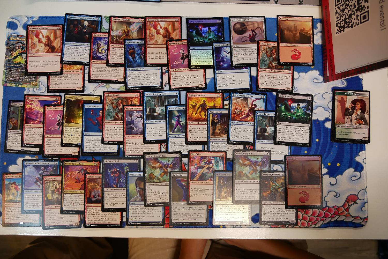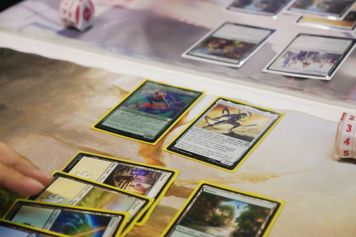 有一回合我場上有Spider-Man India,手上則是兩張Spectacular Tactics和過多的地牌,對手場上有4/3、3/3及1/2生物,因為雙方都是玩Web-slinging的牌組,但只有我有Spider-Man India,我認為對手應該會很想攔下它,所以我利用生物進攻,希望對手選擇全擋,而剛好對手真的想要阻止我利用Spider-Man India擴大優勢,我便能順利利用兩張Spectacular Tactics消滅對手的4/3生物及給自己+1/+1順利建立場面優勢。