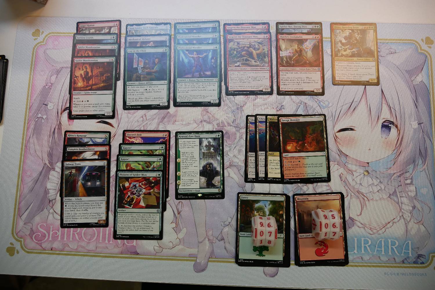 異變蜘蛛&職業摔角手,這兩張是我這系列限制賽測起來,綠底套牌最重要的C卡曲線。這系列的生物體質算相對小的,4費以內身基本攻防能達到4/4+的生物,職業摔角手是唯一的C卡,剩下的都是R卡起跳,加上他無法被聯合阻擋,所以是個非常難擋的優質生物。職業摔角手ETB產的珍寶加上異變蜘蛛的Mana頭能力,也給套牌更多放強力大仔的餘裕,這次我的生物曲線雖然很高,但因為有這些額外的加速,所以整體運作非常順暢,往往是樸實無華的連拍大怪就能壓制到底。