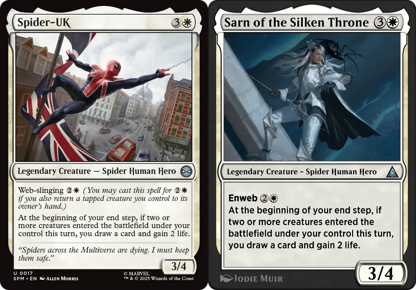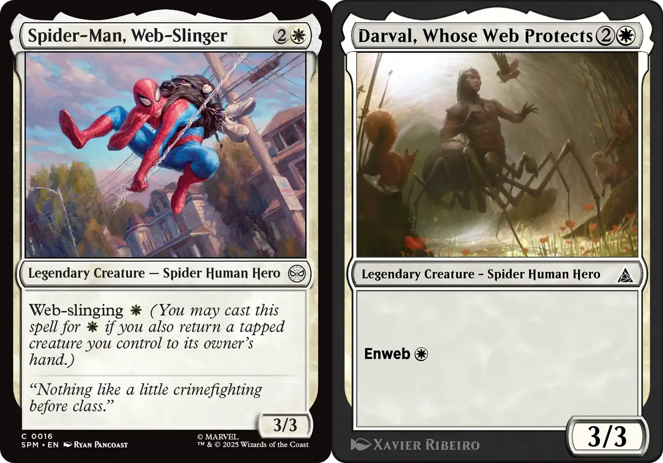 評語:正面非常適合輔助其他具有Web-slinging異能的生物進場,背面則適合讓其他大費用傳奇生物可以透過Web-slinging異能簡單的進場建立優勢,可以說正面與反面適合不同類型的構築,是相當考驗玩家構築能力的單卡。