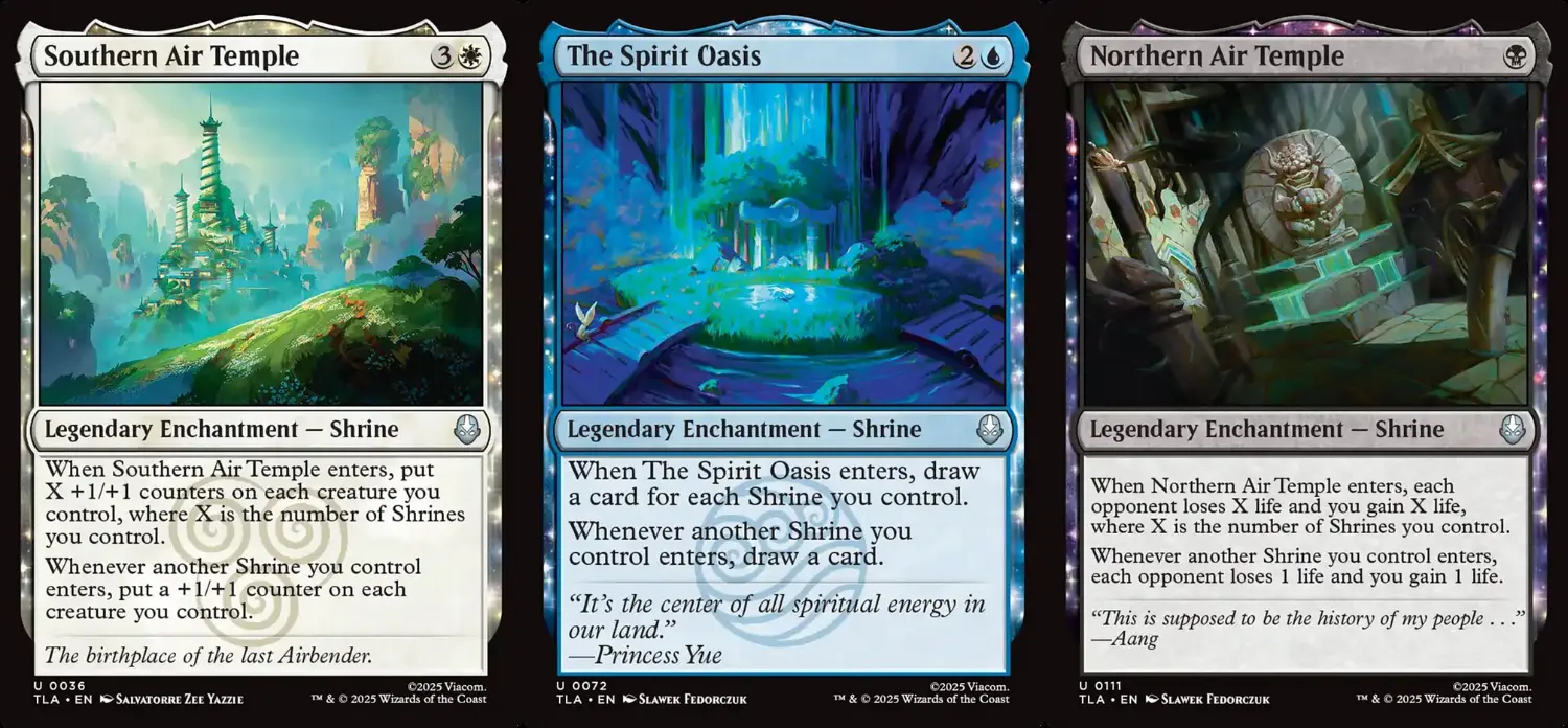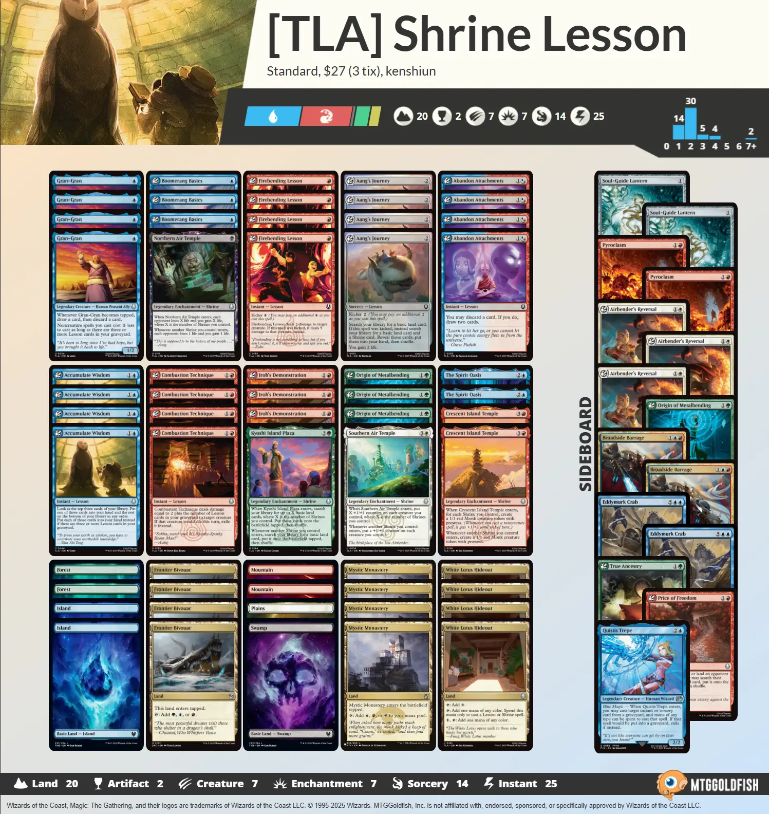 至於這次的祭祠設計,都是本體進場與另一張祭祠進場會觸發的效果,本體進場會看你操控的祭祠數量,其他祭祠進場則是一個,分別是全家放豆的四費南氣和寺、抽牌的三費神靈綠洲、吸血的一費北氣和寺、派出靈技武僧的四費新月島烈火寺,以及找地的四費京島廣場。考慮到這副套牌有導師、魔法力曲線與祭祠效果重要性,僅將藍色抽牌祭祠與獲勝手段紅色生武僧祭祠放到兩張,其他三色僅配一張。