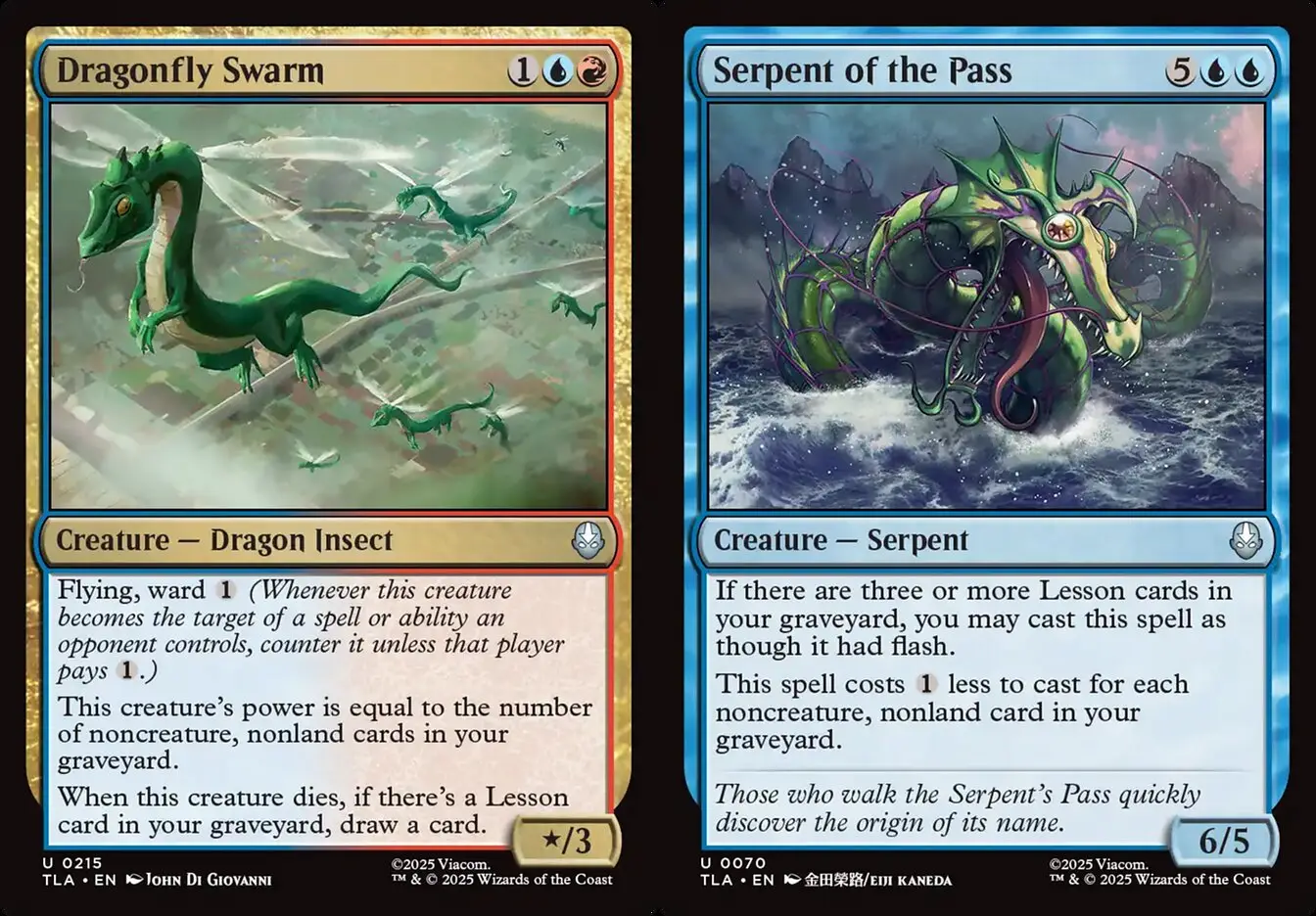 瀏覽一輪《降世神通》的牌表,官方為課程主題準備的低稀有度終結者為龍蜻蜓群與纏關盤蛇,讓玩家可以參照過往紅藍龍獸與紅藍海蛇套牌來構築,但因為這類型的終結者容易被點殺處理,相當考驗駕駛員的操作能力。其實,官方還有準備另一個低稀有度套路: