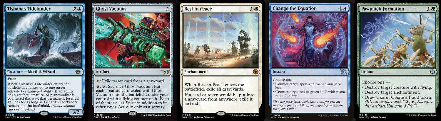 - Tishana’s Tidebinder:這是一張極具針對性的干擾牌,特別用來壓制對手依賴鵬洛客異能的策略。最初被開發出來,是為了對抗如Doomsday Excruciator、Jace, the Perfected Mind、Riverchurn Monument等控制套牌常見的磨牌計畫,透過反擊關鍵的觸發或起動異能為我們爭取時間。其3/2的體質也能轉化為進攻壓力,作為後手轉場或打節奏的利器。不過值得注意的是,雖然某些套牌也有大量強力的觸發或啟動異能,但這些威脅未必非靠Tidebinder解不可,有時候傳統去除或反擊也足以處理,因此這張牌屬於根據環境調整、針對特定對局才會換入的備牌選擇。