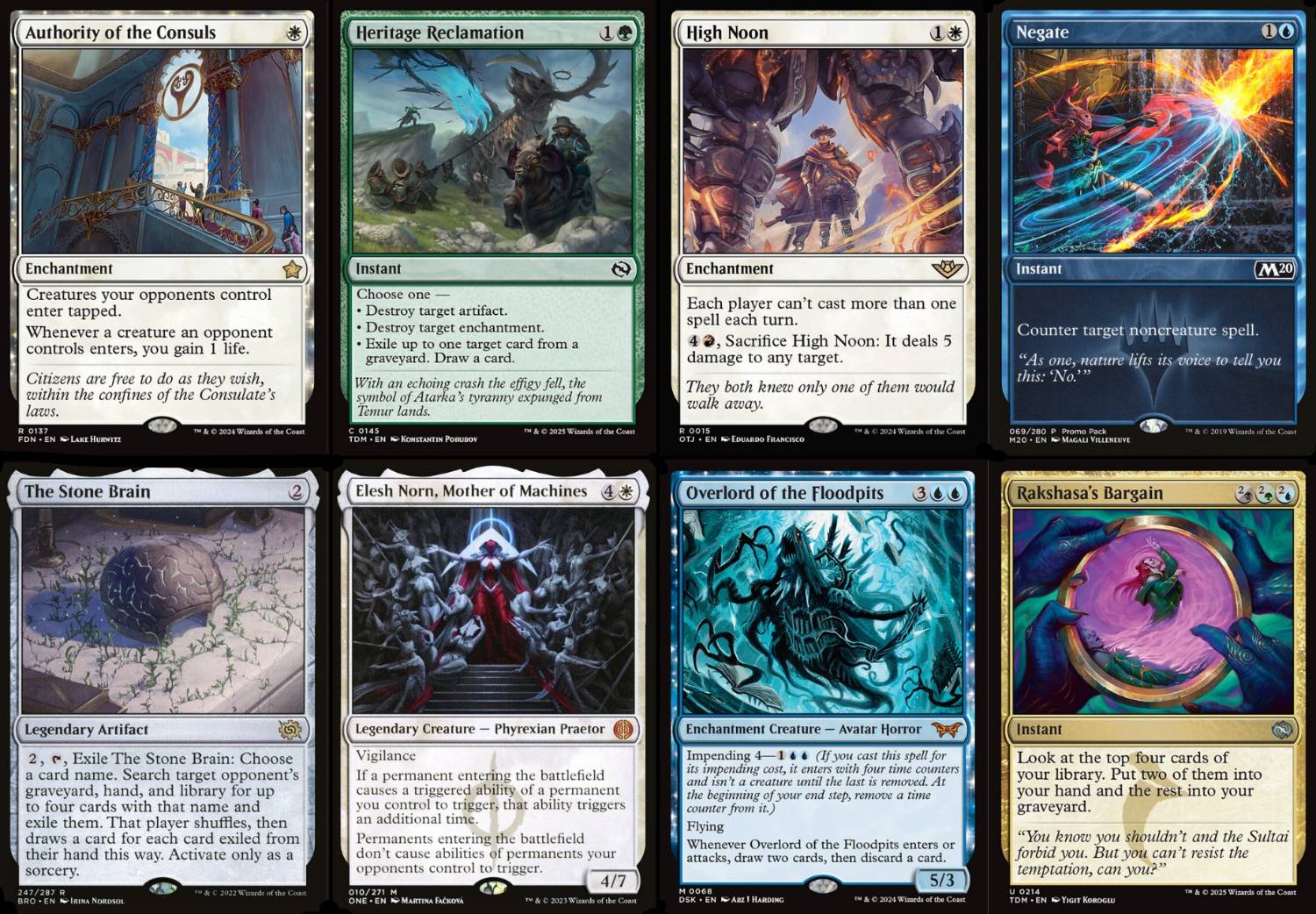 - 1 Elesh Norn, Mother of Machines:主要用於對抗依賴進場觸發異能的套牌,例如Up the Beanstalk、Overlord of the Mistmoors和Marang River Regent等,能有效壓制對手的資源引擎與爆發力。同時也能加倍我方如霸主和刺探地等永久物的進場效果,讓優勢更快擴大。雖然這張牌不適合每個對局,但在慢速內戰或依賴觸發效果的對局中是一張能澈底改變戰局的單卡,因此選擇配置1張作為針對性解答。