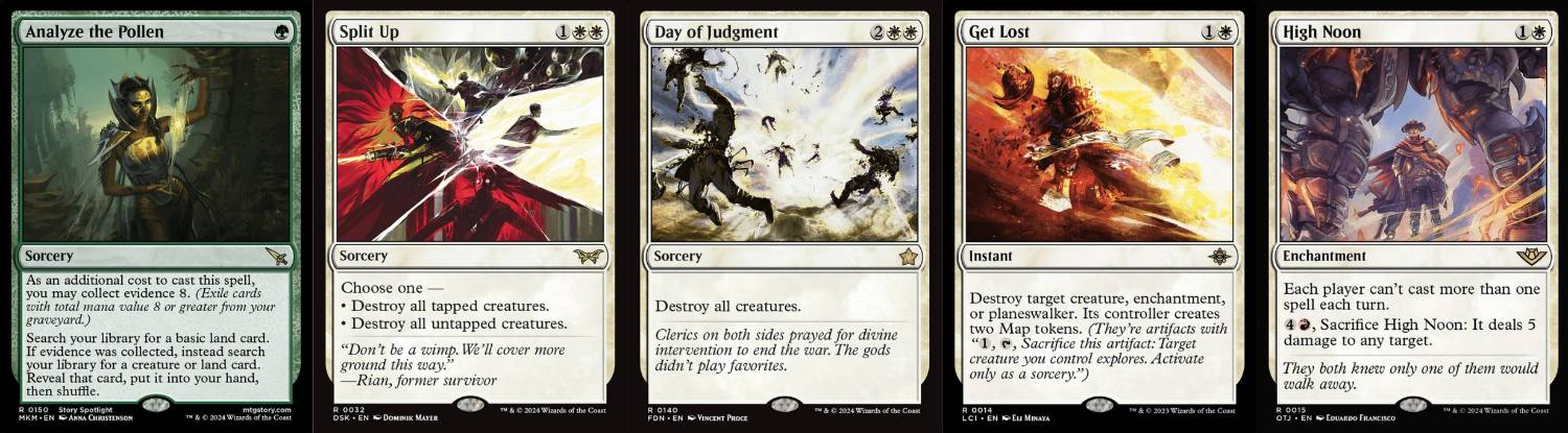 - High Noon:在目前環境中,最受歡迎的兩套牌是紅藍靈技與全知全能組合技。High Noon限制玩家每回合只能施放一個咒語,對這兩套牌都是極具針對性的干擾手段,不僅能有效拖慢它們的進攻或組合節奏,甚至可以說是對抗這兩套牌最優秀的解法之一。