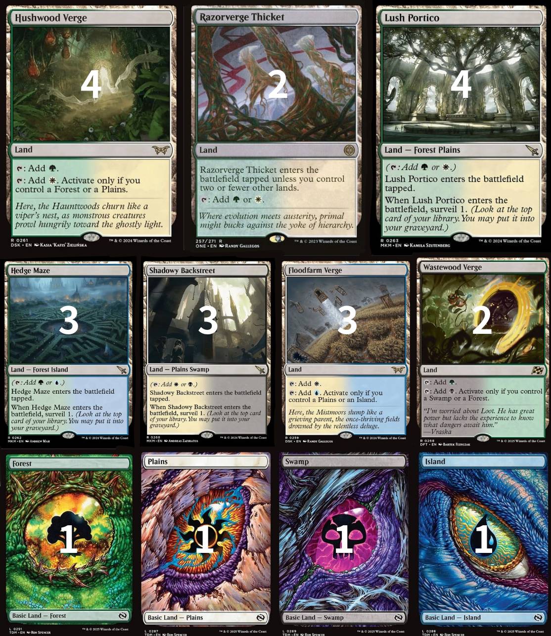 - 因為白綠兩色如此重要,這也直接影響到了其他雙色地牌的選擇,而每個地牌都一定能產出白色或綠色,而Verge會選擇Floodfarm Verge和Wastewood Verge (黑綠Verge)就是因為他們的主色是白色和綠色,這樣即使沒有對應的基本地類別,這兩張地牌也可以幫助我們施放牌組中的低費咒語。(藍綠Verge的主色是藍、黑白Verge的主色是黑)