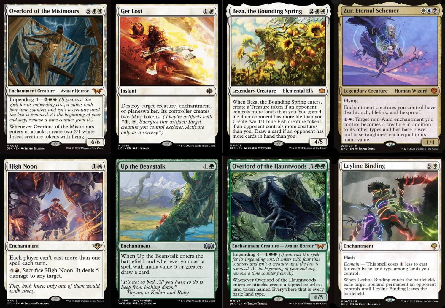 Zur, Eternal Schemer、Overlord of the Hauntwoods、Overlord of the Mistmoors、Up the Beanstalk、和Leyline Binding這些牌都是這套牌的最最核心。比較需要介紹的是以下幾張,他們有些是作為潤滑劑被投入使用、其餘的則是在對抗環境中的T1套牌表現優秀。