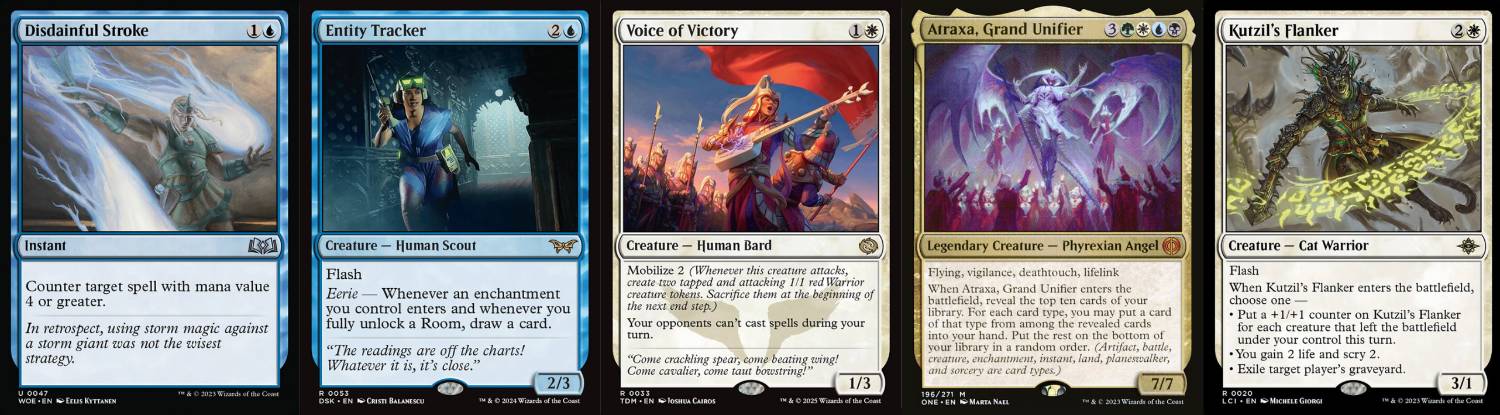 - Atraxa, Grand Unifier:打中速和控制對局的強牌,因為是生物的關係在中後期可以用Analyze the Pollen找出來補一波資源,也能用Cavern of Souls喊Phyrexian讓其不能被康。
