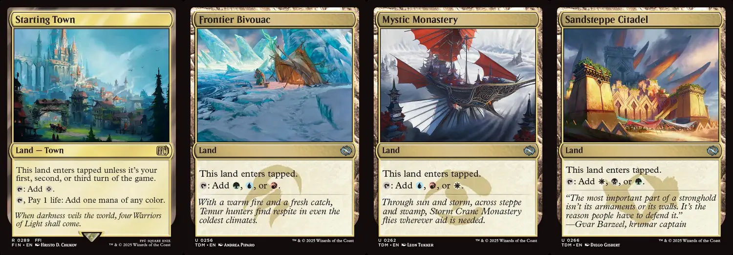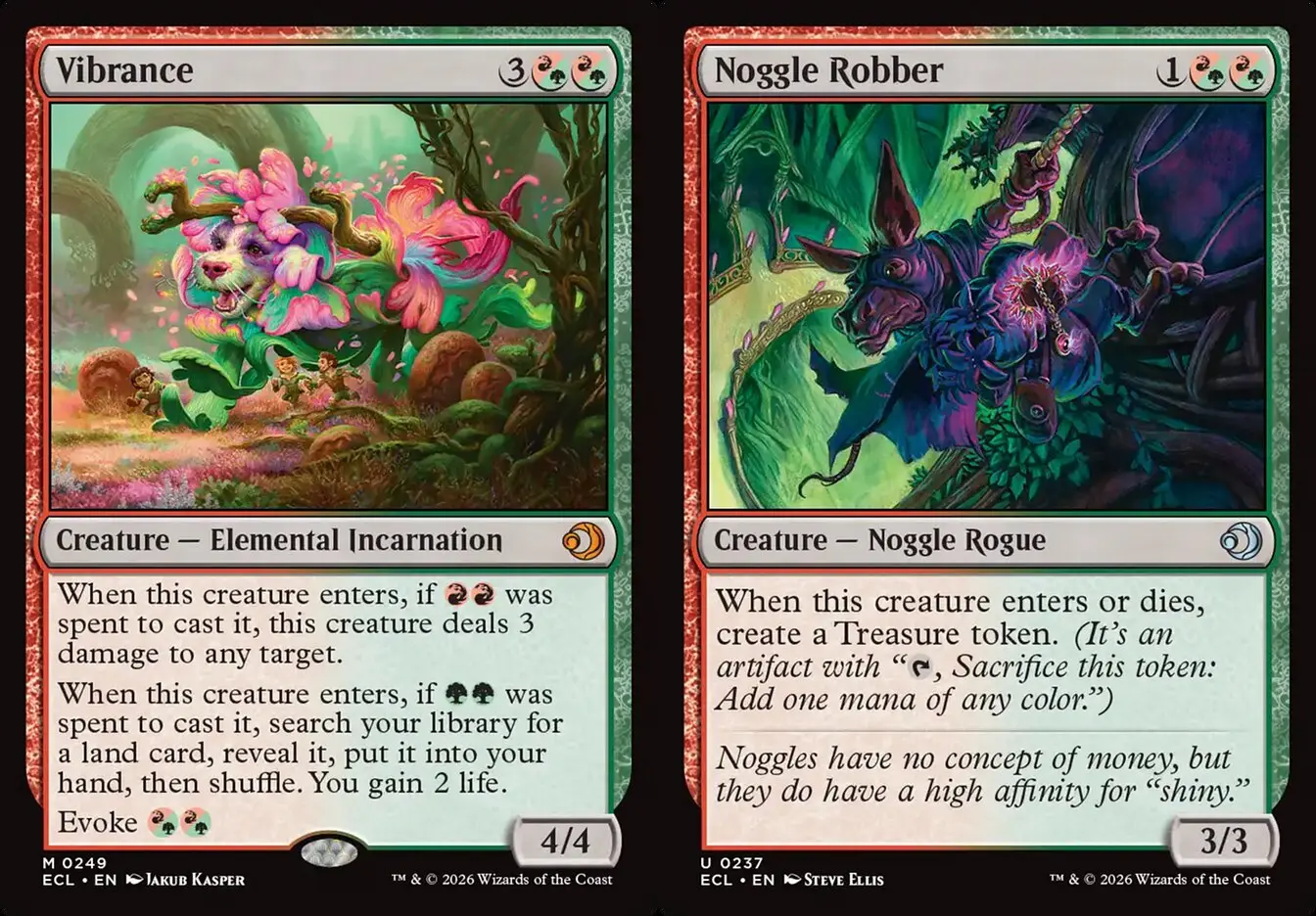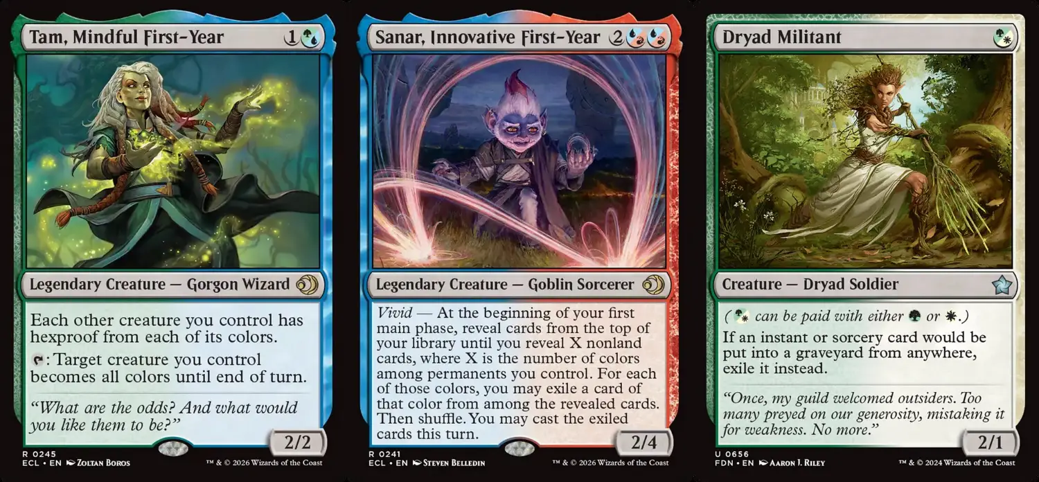 首先,我們來看看《洛溫:闇影壟罩》為我們帶來的混血好夥伴。紅綠色組的歡騰與諾格搶匪,一個找地一個生珍寶,為我們提供五色法力調色基礎;從斯翠海文迷路過來的藍綠色警覺新生譚姆,為自家其他生物提供反自身顏色辟邪的防護,讓十會盟尼米捷直接反五色;同樣來自斯翠海文的紅藍色求變新生賽納爾,在多色永久物套牌裡是超強抽牌引擎,筆者在限制賽使用時常常沒幾回合就把牌庫抽乾;最後是在FDN復刻的拉尼卡原生白綠色好鬥樹靈,混血一費2/1輕巧好叫,站在場上還能牽制有運用到墳場的瞬間巫術型套牌。