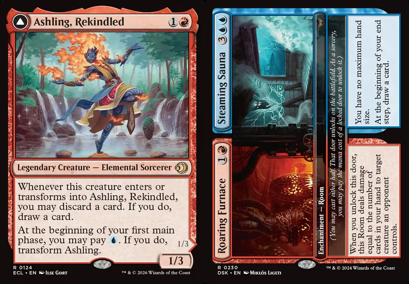 最後是偽單色牌的部分。一個是時下正夯、兼具加速濾牌功能的四費以上咒語專用法力生物覆炎灰兒,另一個是紅藍房間熱火熔爐間//蒸汽桑拿室,作為低費去除使用(房間全開時就會變雙色)。