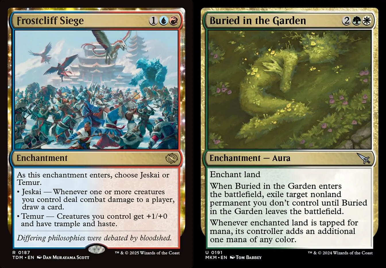 接著是正統雙色牌,筆者選用提供敏捷踐踏的圍攻霜崖、去除兼加速調色的葬於花園,以及可以派出雙色衍生物的黑白旅法靈魂判官卡婭與紅白昆托力康德。