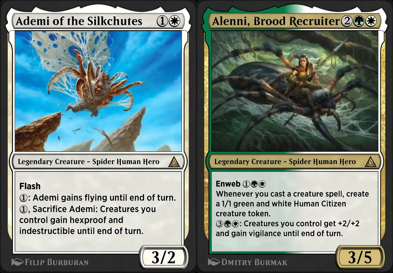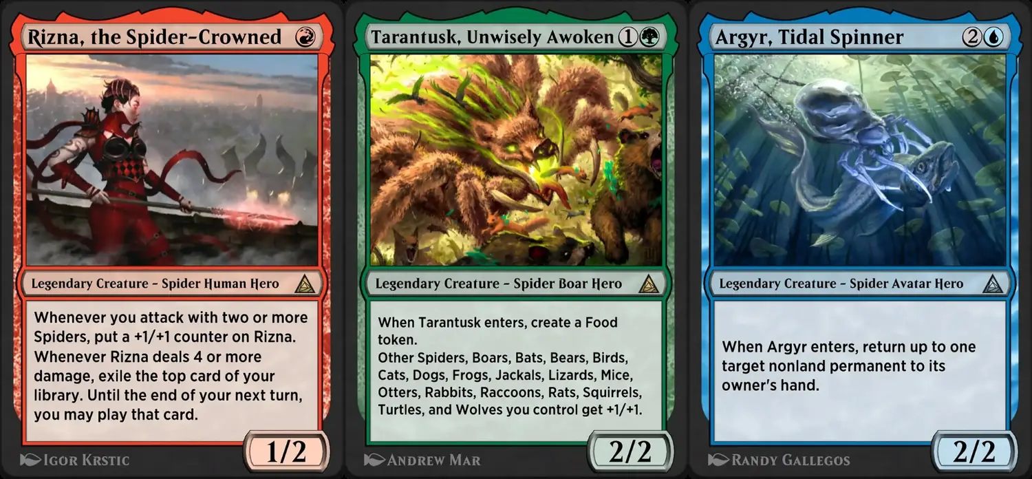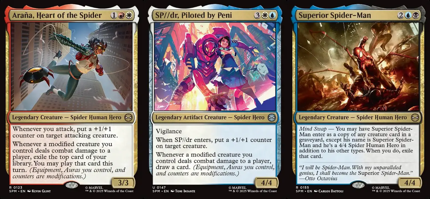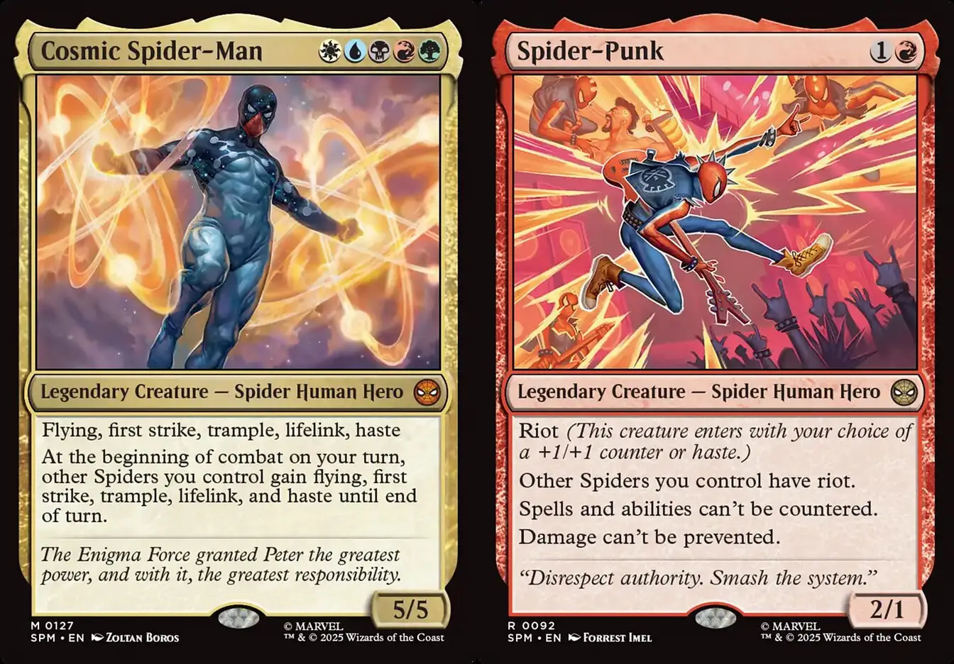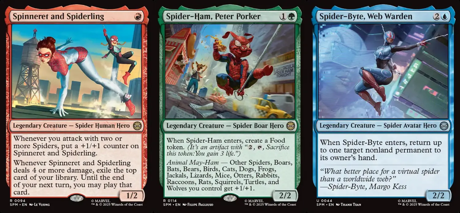 本套牌選用的蜘蛛人,除了最終兵器宇宙蜘蛛人以外,還有龐克蜘蛛人、神奇蜘蛛人、織網者蛛絲、吐絲與蜘蛛仔、豬豬人彼得·豬客、羅網守護者極客蜘蛛人。以主力配多、功能性配一的原則進行構築。宇宙蜘蛛人和龐克蜘蛛人是主力生物,前者是帶全家蜘蛛起飛的收頭戰神,後者則是全家起事兼防反擊防減傷的二費曲線,需要注意的是,龐克蜘蛛人的防反擊與防減傷是全場適用,對手不能反擊你的咒語或異能,你也不能反擊對手的,且所有生物的守護(Ward)會因此無效化。其他蜘蛛人是功能性選配,防掃場的神奇蜘蛛人、鋪場兼後備勝利手段的織網者蛛絲、會成長的一費曲線吐絲與蜘蛛仔、相當於第四張龐克蜘蛛人的領主豬豬人彼得·豬客,以及進場踢非地永久物回手的軟去除極客蜘蛛人。