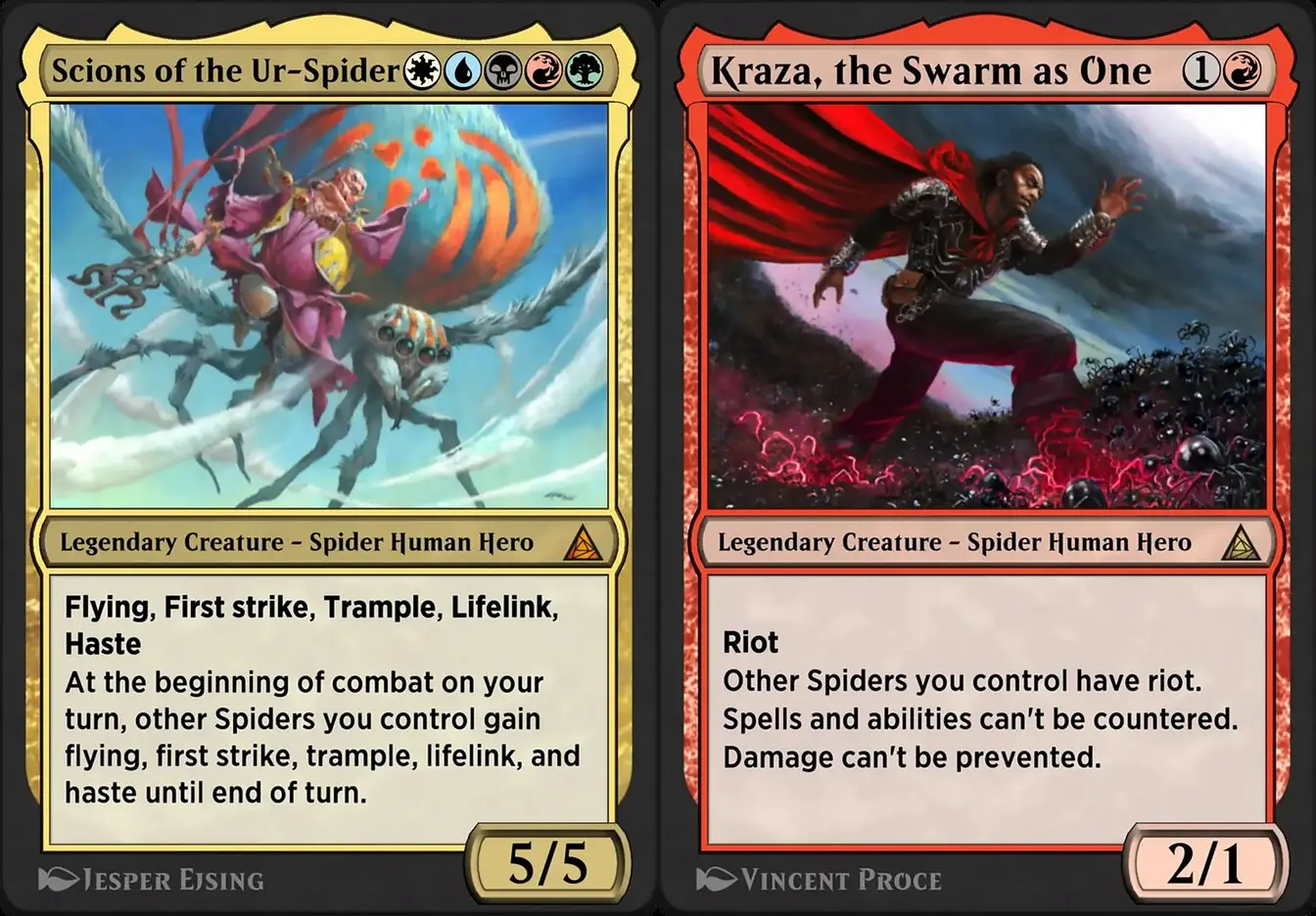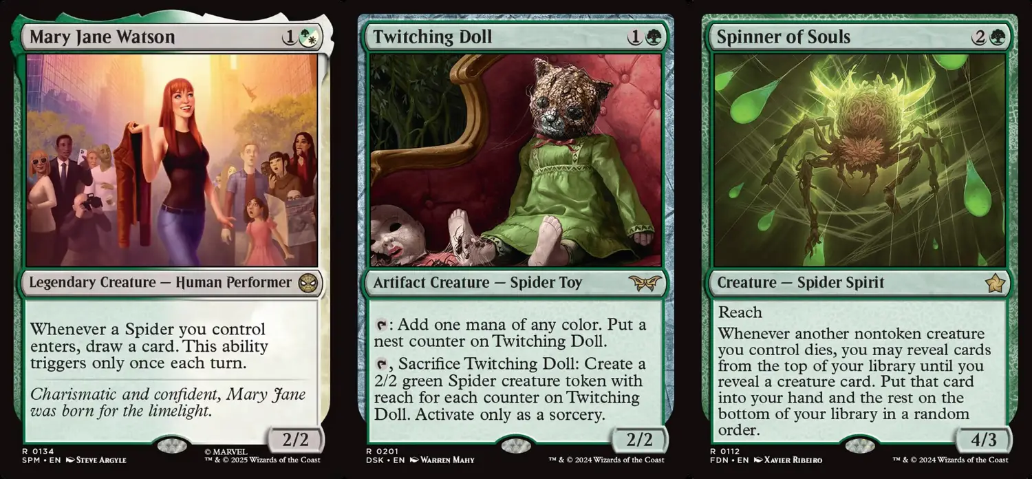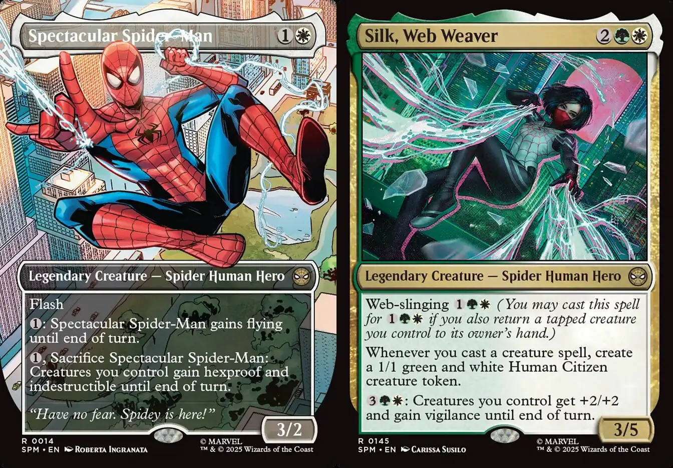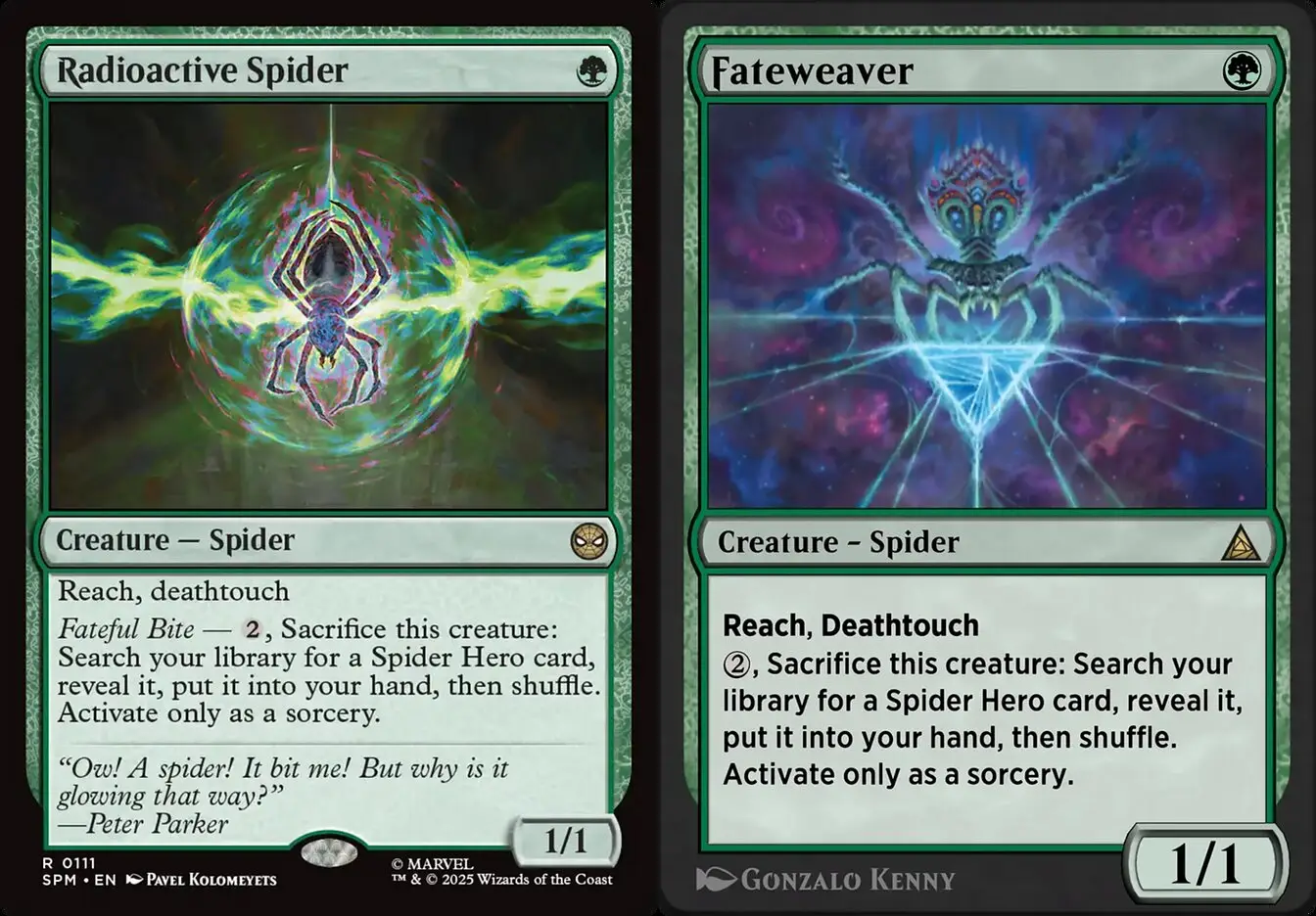 雖說是蜘蛛人套牌,但純蜘蛛生物卻是本套牌的中流砥柱。放射性蜘蛛、抽肢娃娃、織魂蛛與瑪麗·珍相輔相成,在嚇阻對手進攻的同時,還發揮強大的資源能力,為你的蜘蛛英雄提供最佳後援。