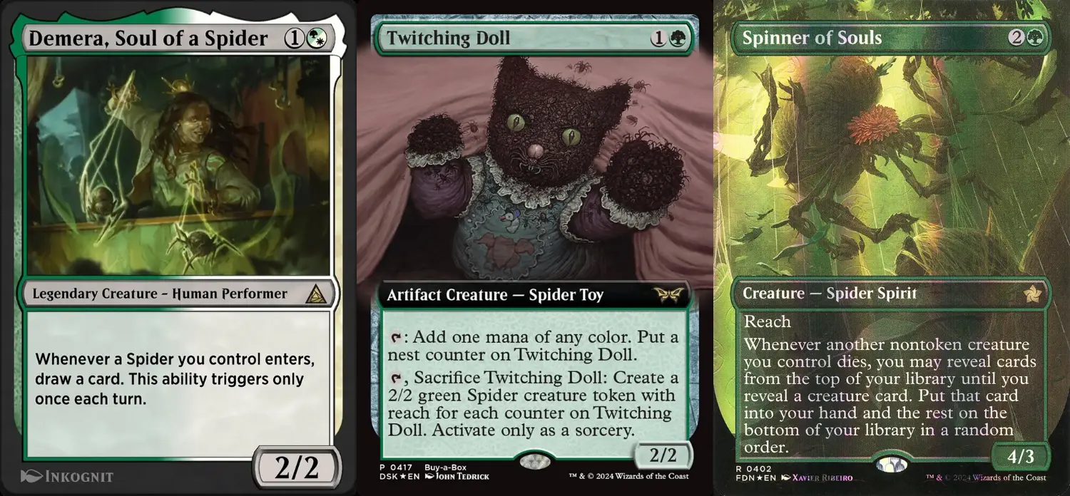 說完蜘蛛英雄們,接下來是輔助生物的部分。首先是抽牌引擎,官方在本系列提供的是蜘蛛人系列女主角瑪麗·珍·華生,只要是你的蜘蛛生物進場就會抽牌(一回一次),支援範圍不限蜘蛛英雄,所以其他輔助生物的選牌也會是蜘蛛。再來是來自本家的抽肢娃娃和織魂蛛。抽肢娃娃是五色套牌需要的任意色魔法力生物,每次產法力會在身上放巢窩指示物,可以犧牲派出與其上指示物(不限巢窩)等量的2/2延勢蜘蛛衍生物,在這副套牌內有很多互動,搭配宇宙蜘蛛人或龐克蜘蛛人現衝一波帶走對手也不是不可能。織魂蛛則是將其他你死去的非衍生物轉化成一張新的生物牌,不僅是對掃場的保護措施,搭配放射性蜘蛛與抽肢娃娃這類主動犧牲的生物,可以換到更多資源。