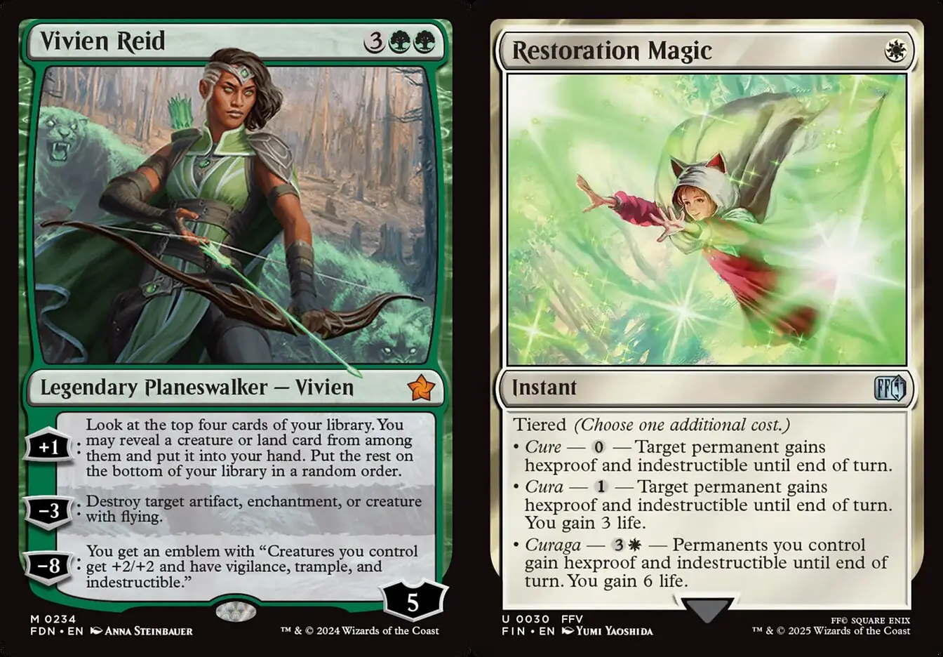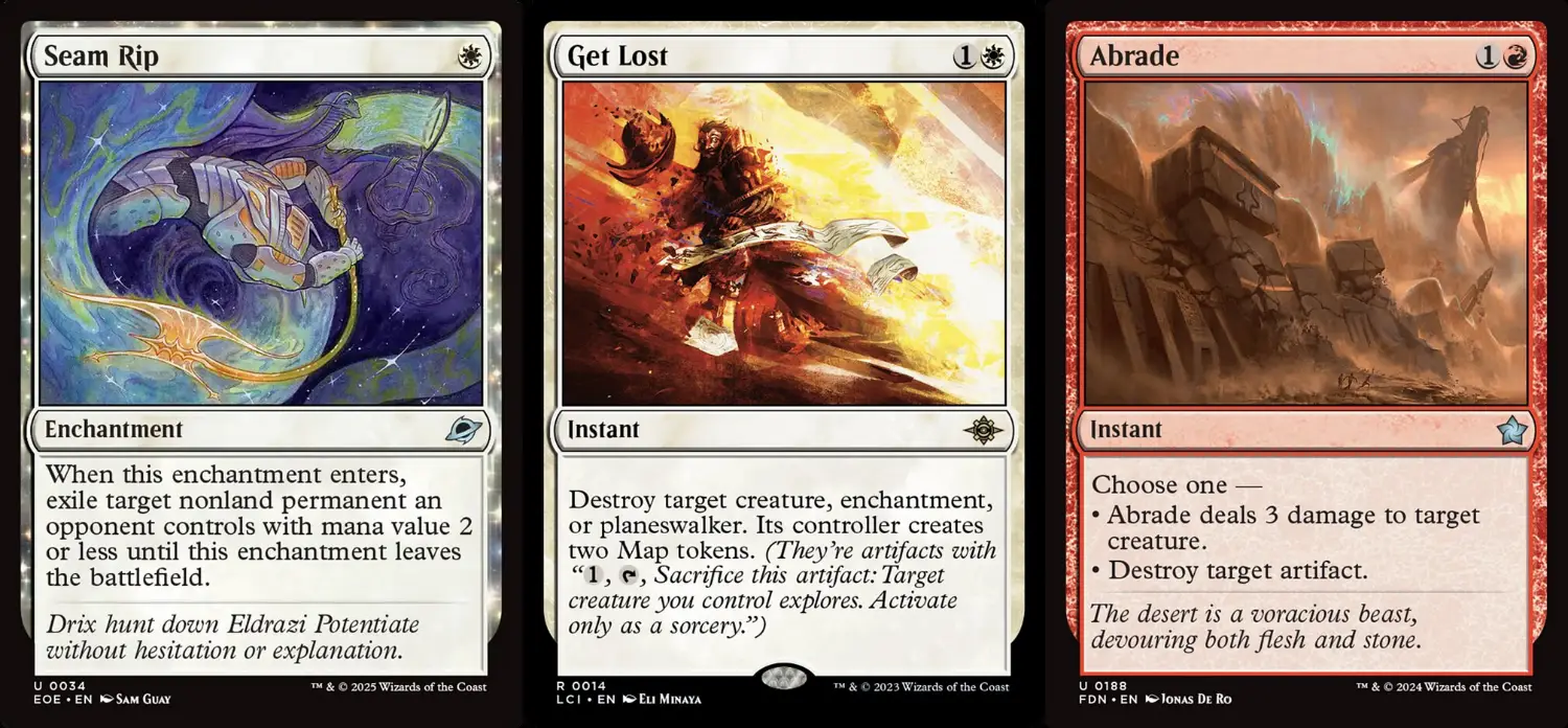 最後是非生物咒語。去除選用接縫裂痕、速速退離、風化侵蝕,以及兼具抽牌引擎功能的薇薇安瑞德,處理各式永久物威脅。為了保護關鍵的抽牌與終結生物,再正編三張恢復魔法防去除(反擊類咒語會被自己的龐克蜘蛛人無效化)。